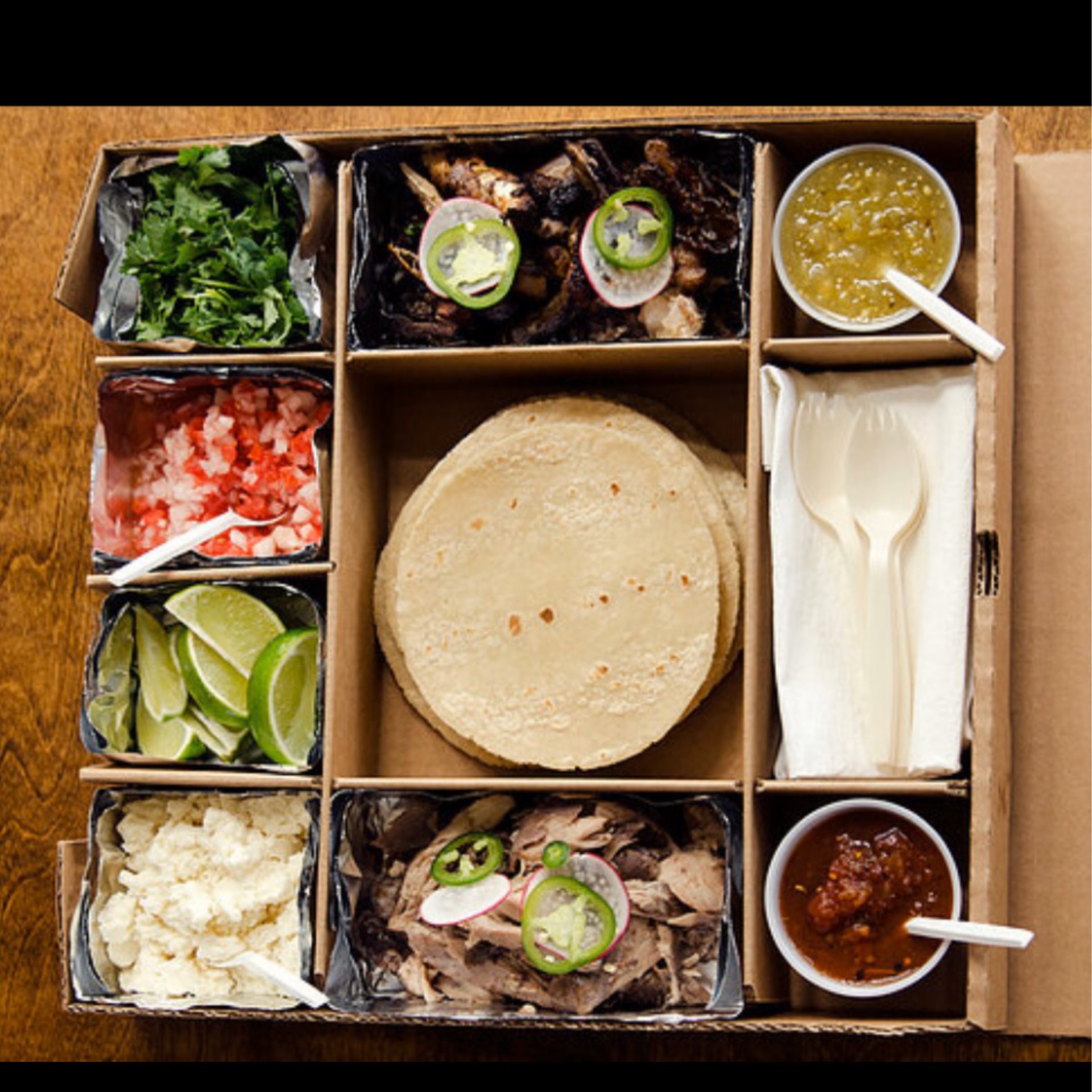 10 Tacos: Includes choice of TWO (2) MEATS plus flour tortillas, corn tortillas or 1/2 & 1/2 and all the ingredients needed to make tacos at home (feeds 4-6 people) 20 Tacos: (feeds 10-12 people) choice of THREE (3) MEATS Served with chips & salsa