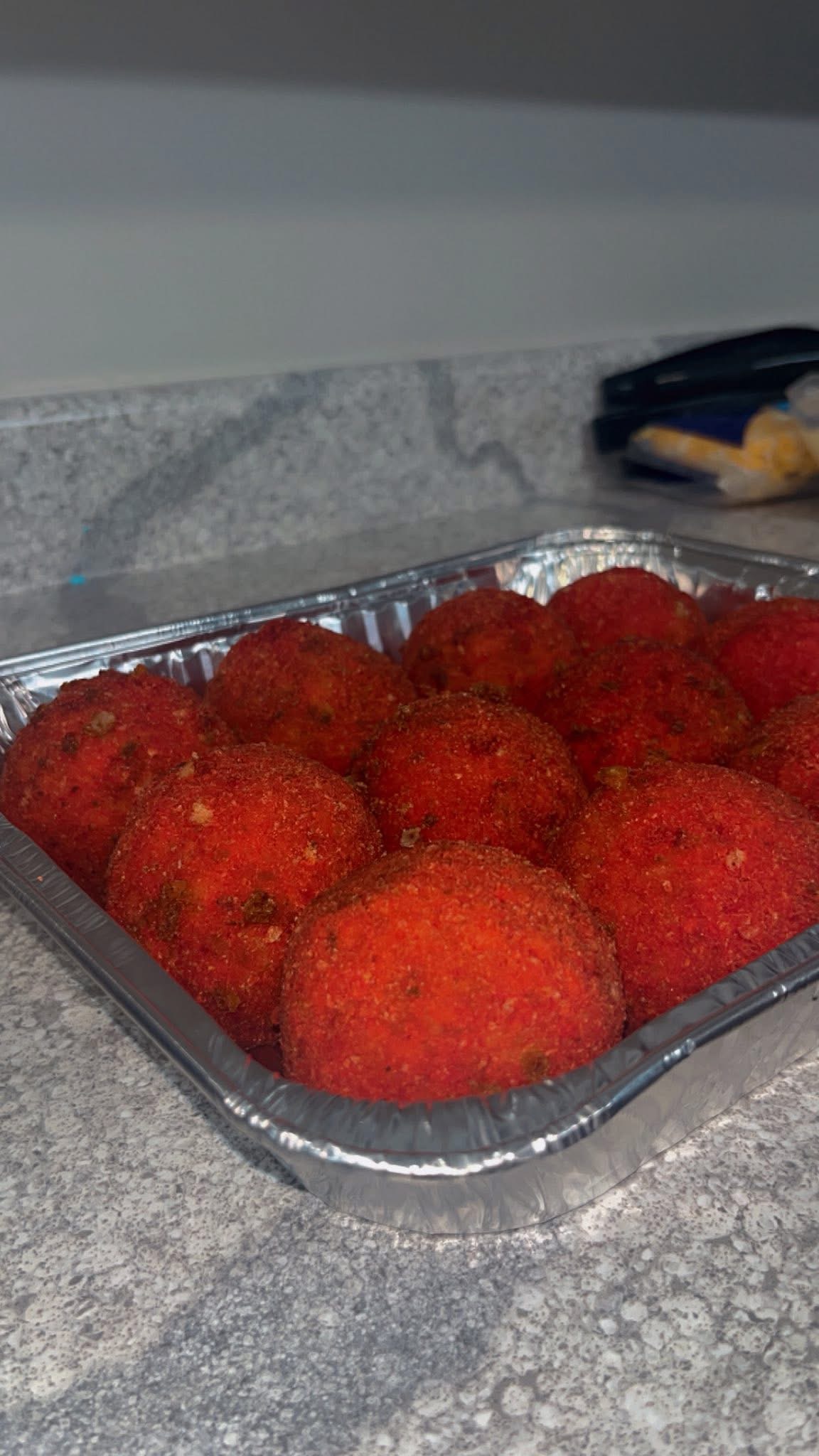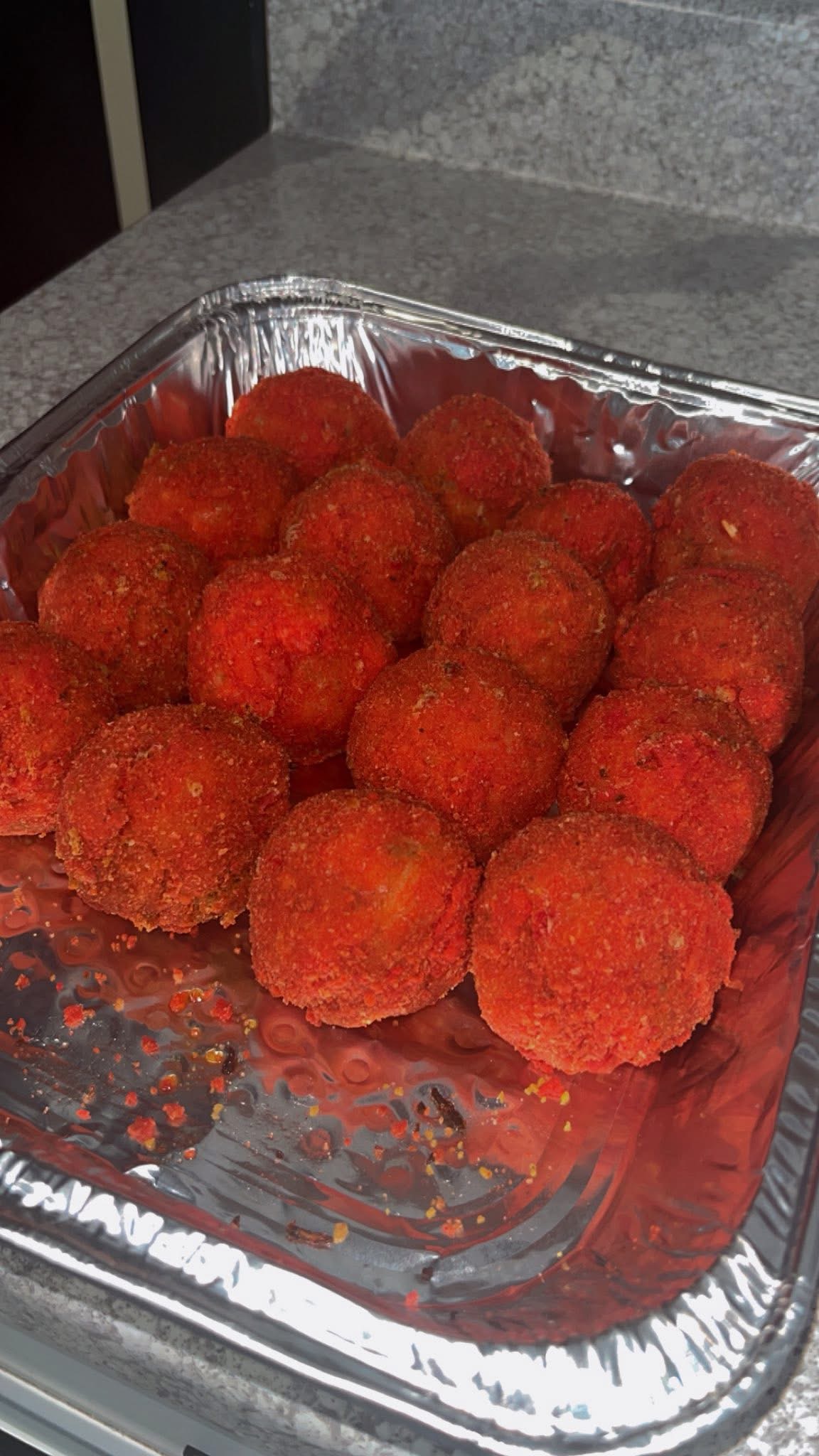 12 LARGE CHEESY BOUDIN BALLS WITH FLAMING HOT CHEETOS CRUST (COMES WITH 4 OUNCES OF OUR SWAMP SAUCE) - *All BAYOU BITES/CAJUN BOMBS are deep fried and loaded with Cajun Rice, Cheese and Boudin Meat. Coated with Flaming Hot Cheetos.
