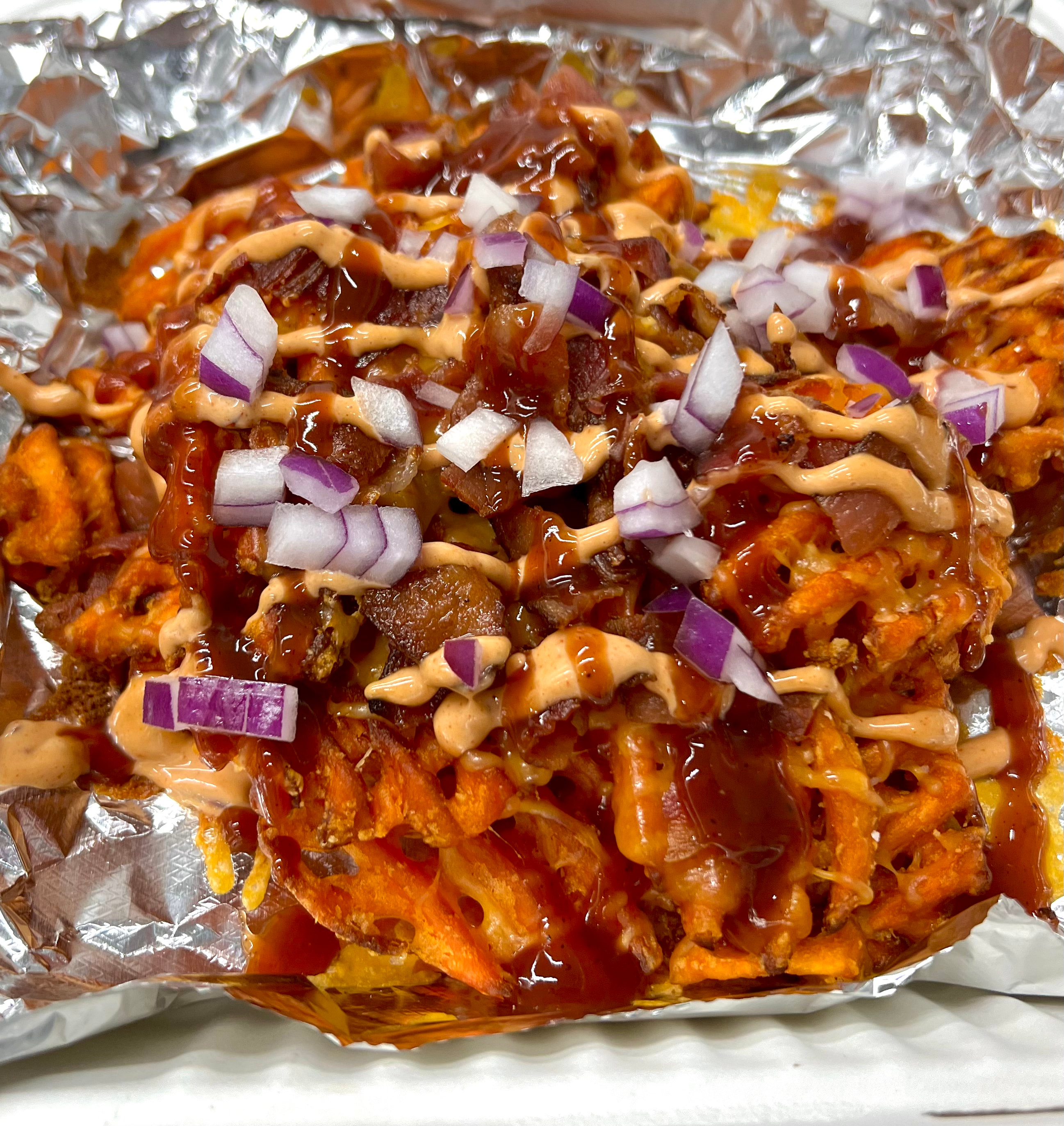 Sweet potato waffle fries, shredded cheese, house-made Huckleberry BBQ sauce and chipotle mayo garnished with diced red onion.