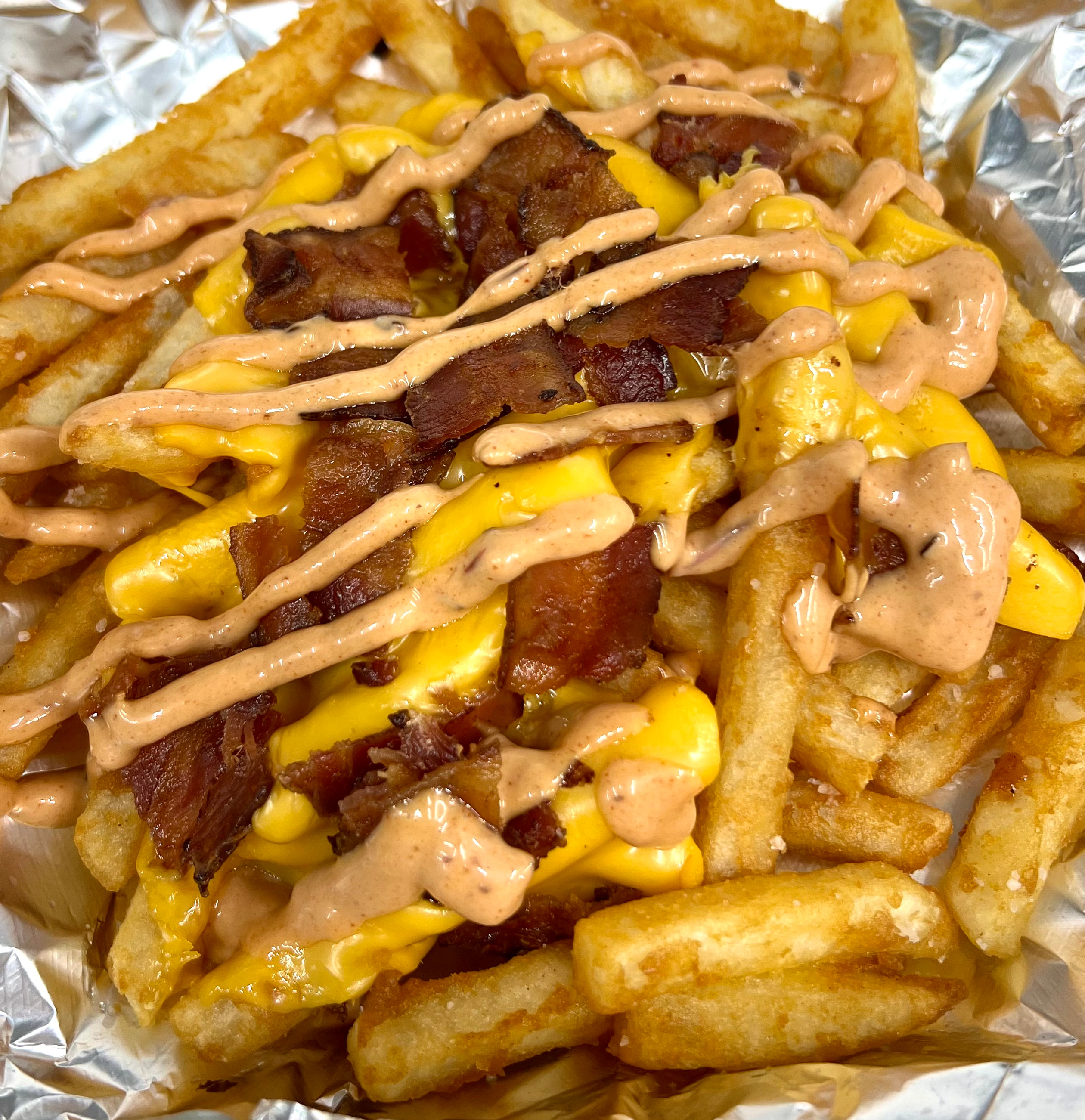 Crispy french fries topped with American cheese, bacon and our signature SMASH sauce.