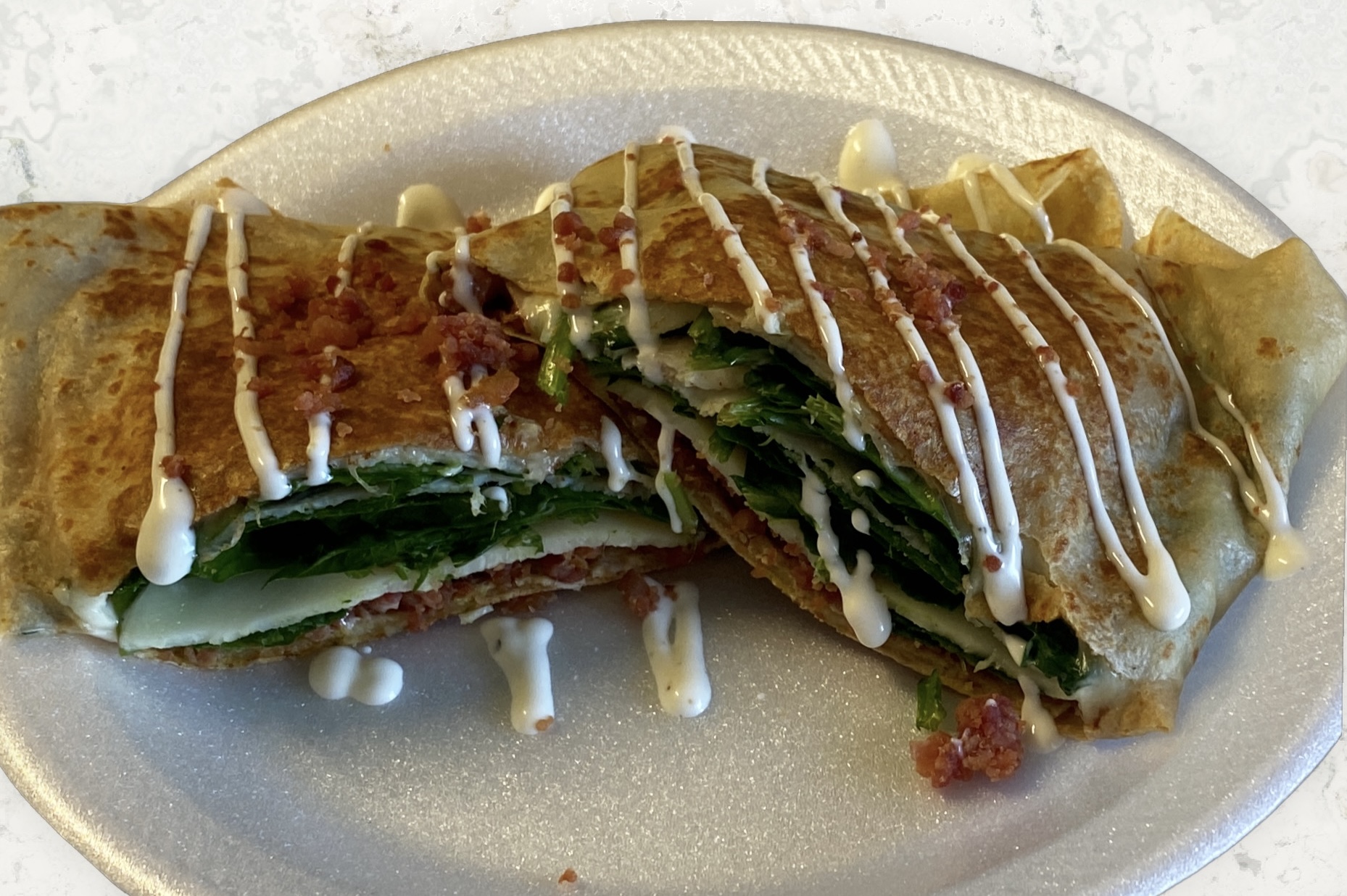 Grilled rotisserie deli style chicken and real bacon chunks on top of a bed of fresh spinach, provolone cheese, and ranch sauce.