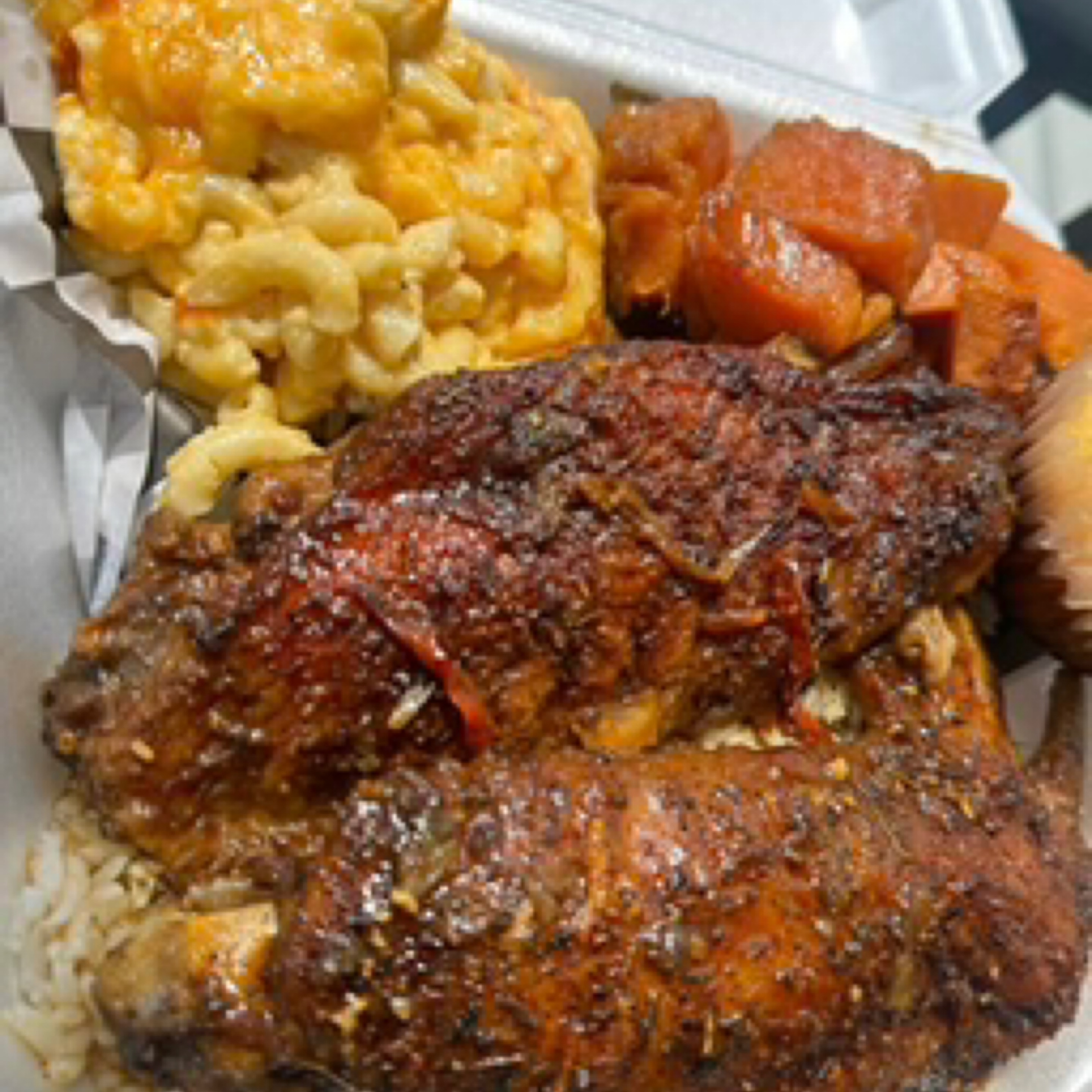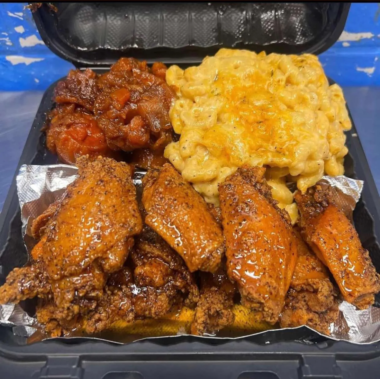 Two Turkey wings, White Rice, Macaroni & Candied Yams