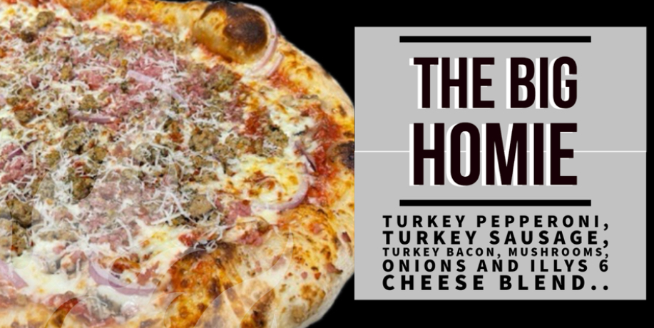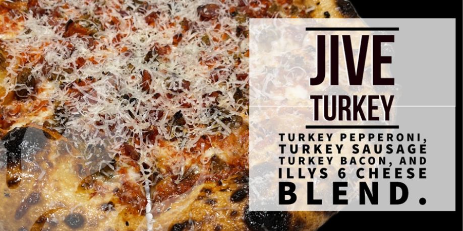 TURKEY PEPPERONI, TURKEY SAUSAGE, TURKEY BACON & OUR ILLYS 6 CHEESE PIZZA BLEND.