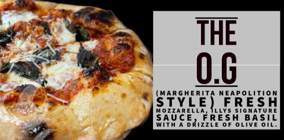 (Margherita Neapolition Style) Fresh Mozzarella, ILLYS Signature sauce, fresh basil with a drizzle of Olive oil.