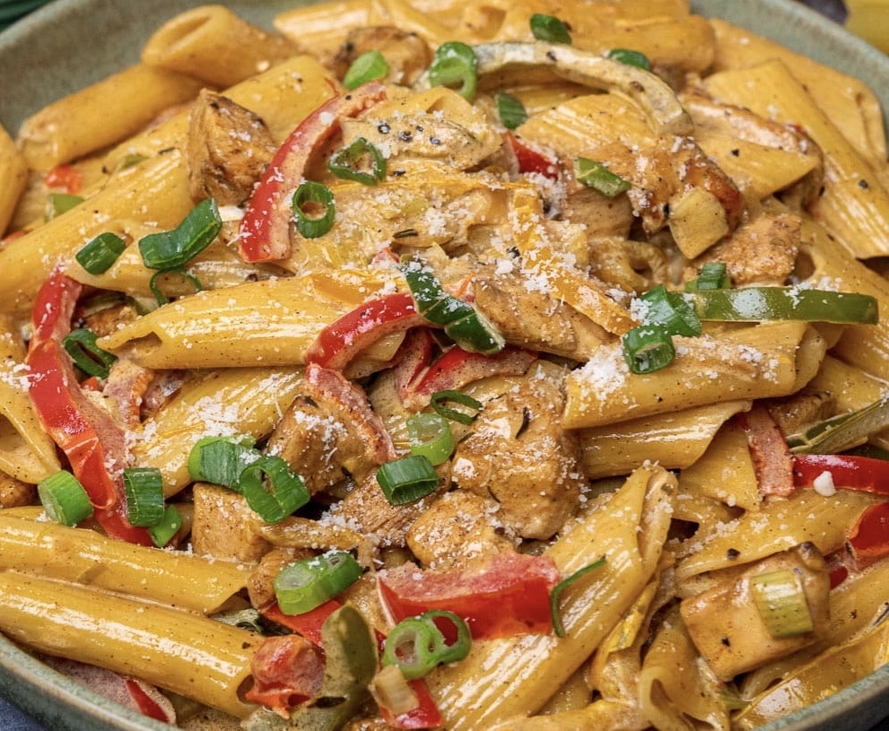 Jackfruit, Bell Peppers with Vegan Gluten Free Penne Pasta sautéed with Jamaican Jerk Spices in a Creamy Sauce!