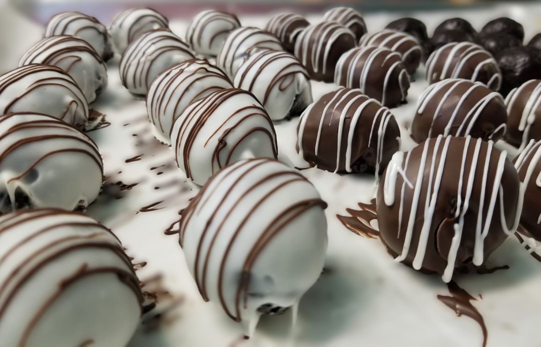 Crumbled Oreo cookies mixed with cream cheese and dipped in your choice of milk or white chocolate