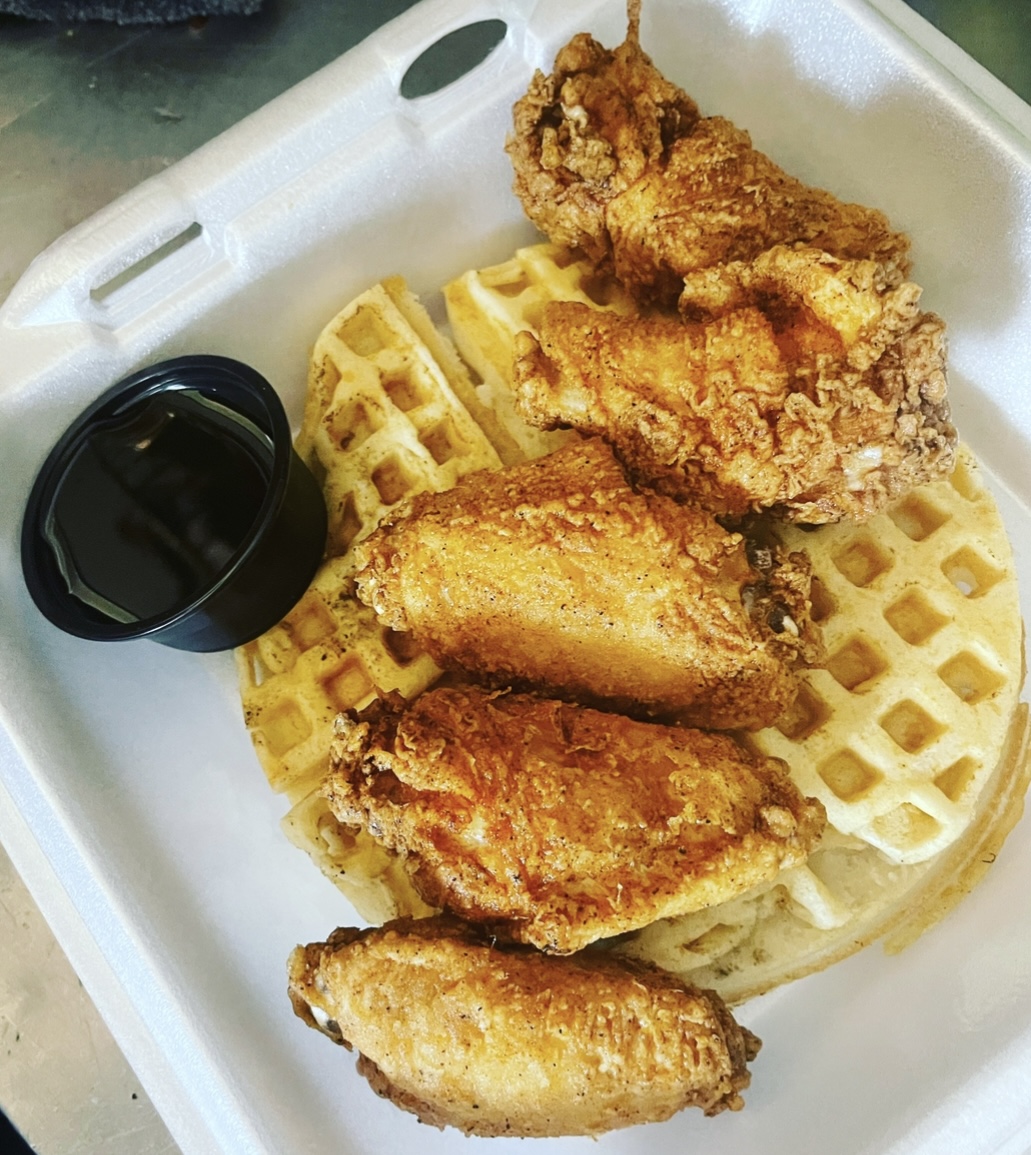 Your choice of sauce (or plain) over five wings, served with seasoned waffle fries Wing Sauce: BBQ, Buffalo, Lemon Pepper, Jerk, Sweet Thai Chili