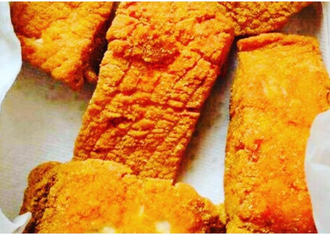 Deep fried salmon or bites , served with served with seasoned waffle fries