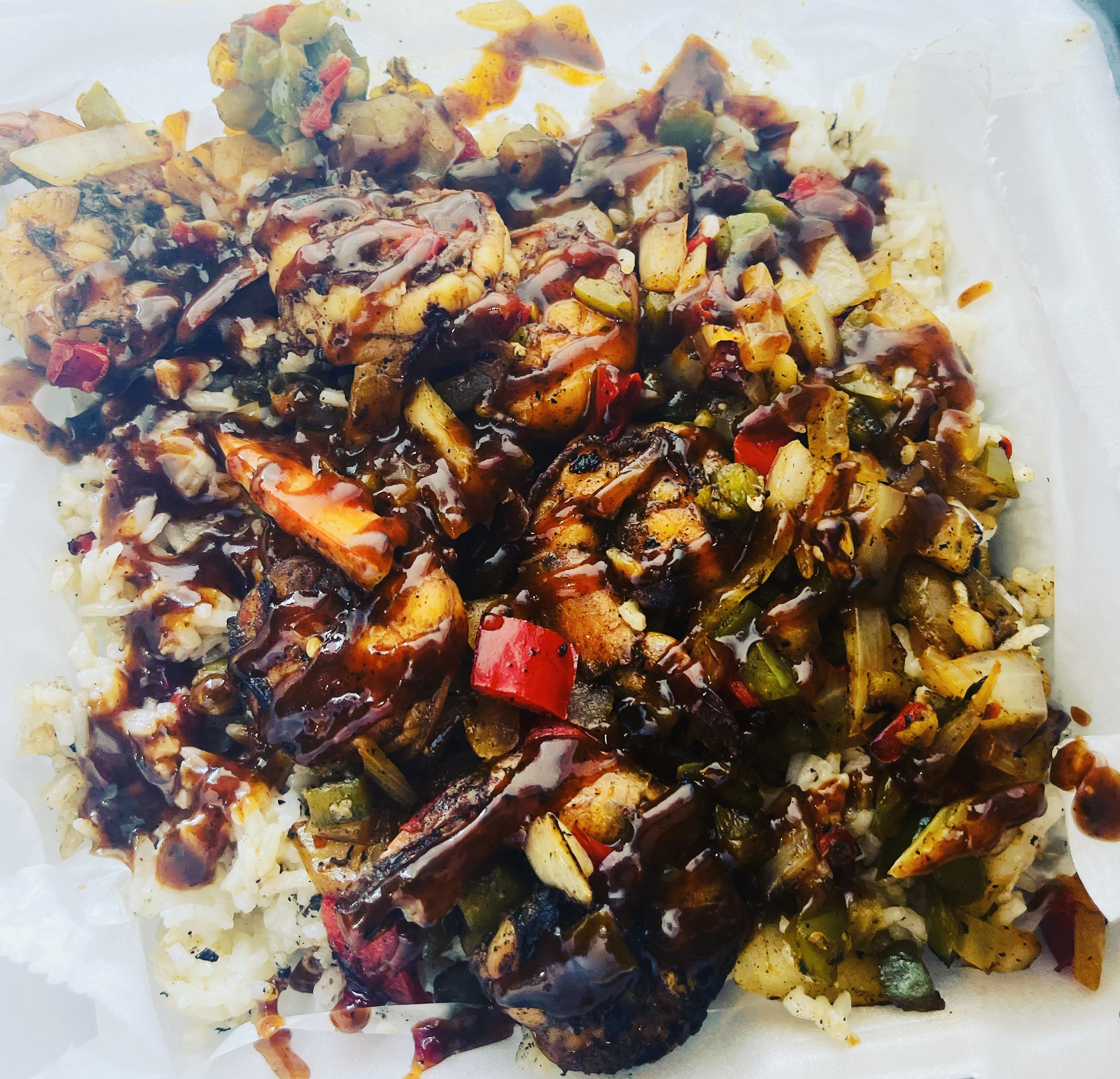Jerk Shrimp W Onions & Peppers Over Season Rice W/ Jerk Sauce