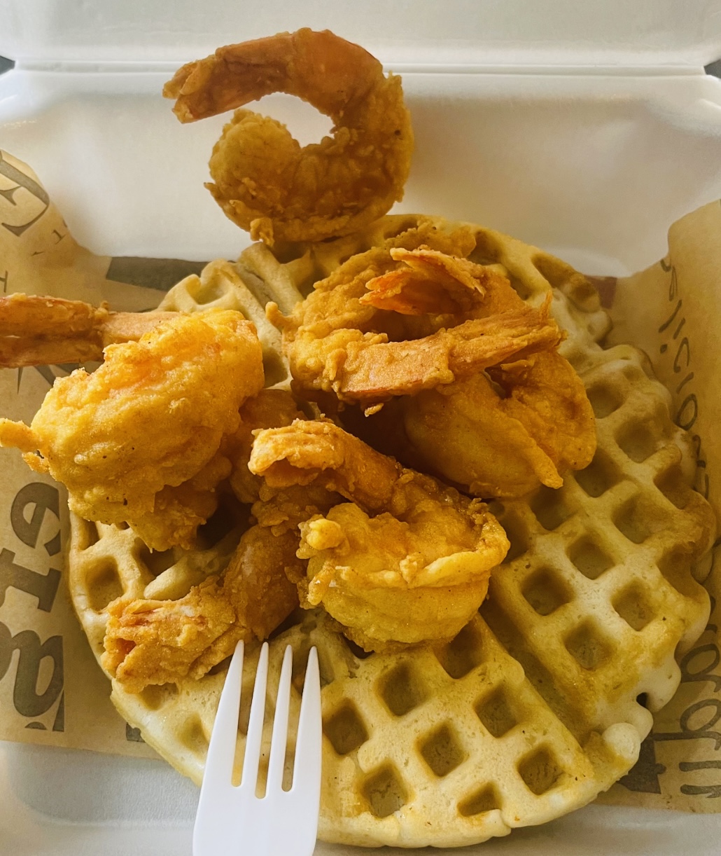 Your choice of buttermilk or red velvet waffles topped with crispy chicken and a sweet glaze