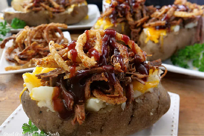 Jumbo Idaho potato smothered in creamy mac-n-cheese, topped with your hardwood-smoked pulled pork, onion tanglers, with BBQ sauce drizzled across the top.