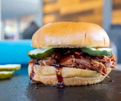 Hardwood-smoked pulled pork, piled high and topped with our creamy coleslaw, all served on a toasted brioche bun. Comes with one side and crunchy pickle chips for the perfect BBQ basket.