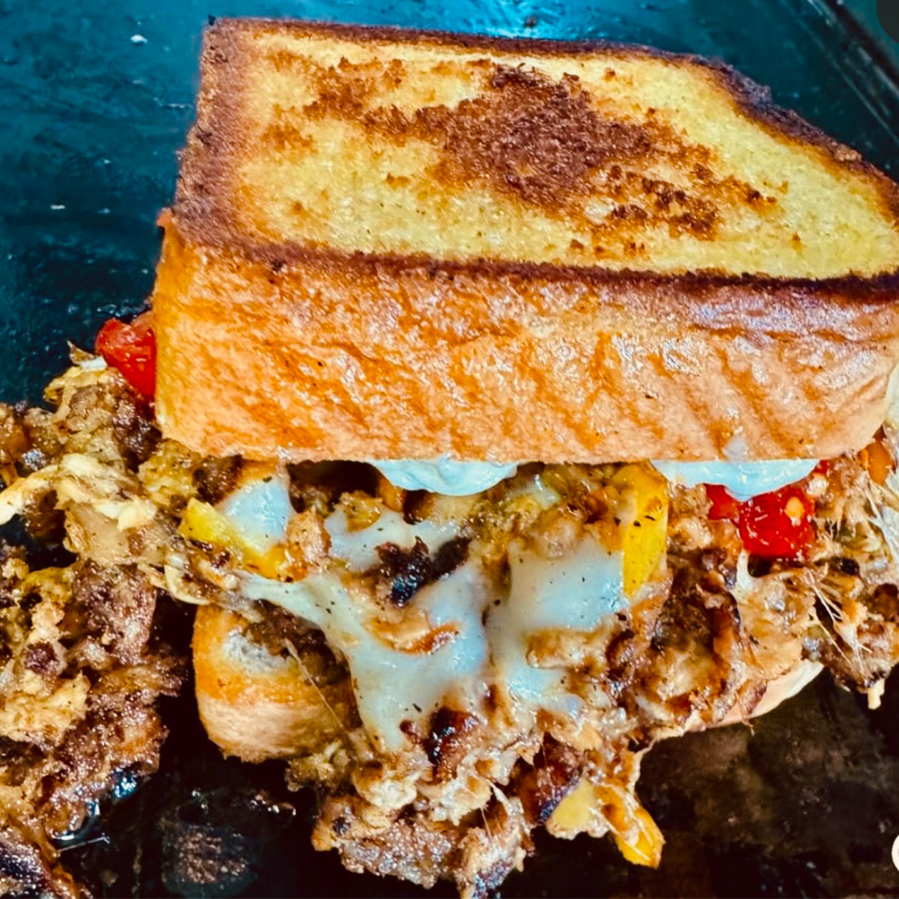 Juicy cheesesteak layered on thick Texas toast, topped with melted American cheese Peppers and Onions. Served with a side of crispy homestyle potatoes.