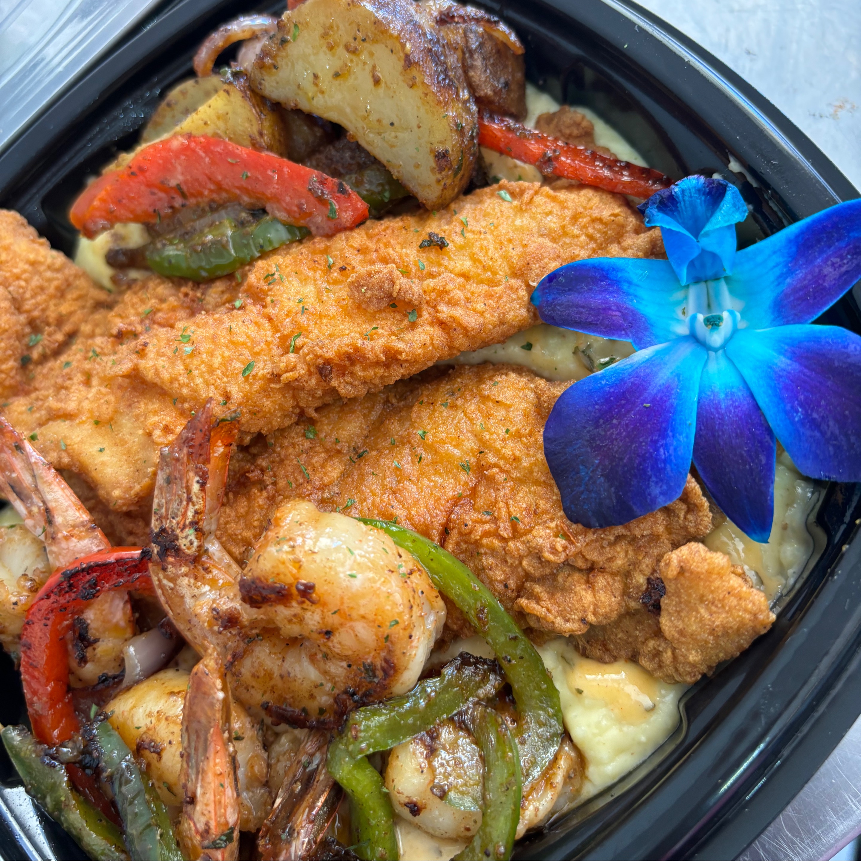 The best of both worlds….Fried Catfish with grilled shrimp, perfectly seasoned and served over creamy grits, accompanied by sautéed peppers and onions.