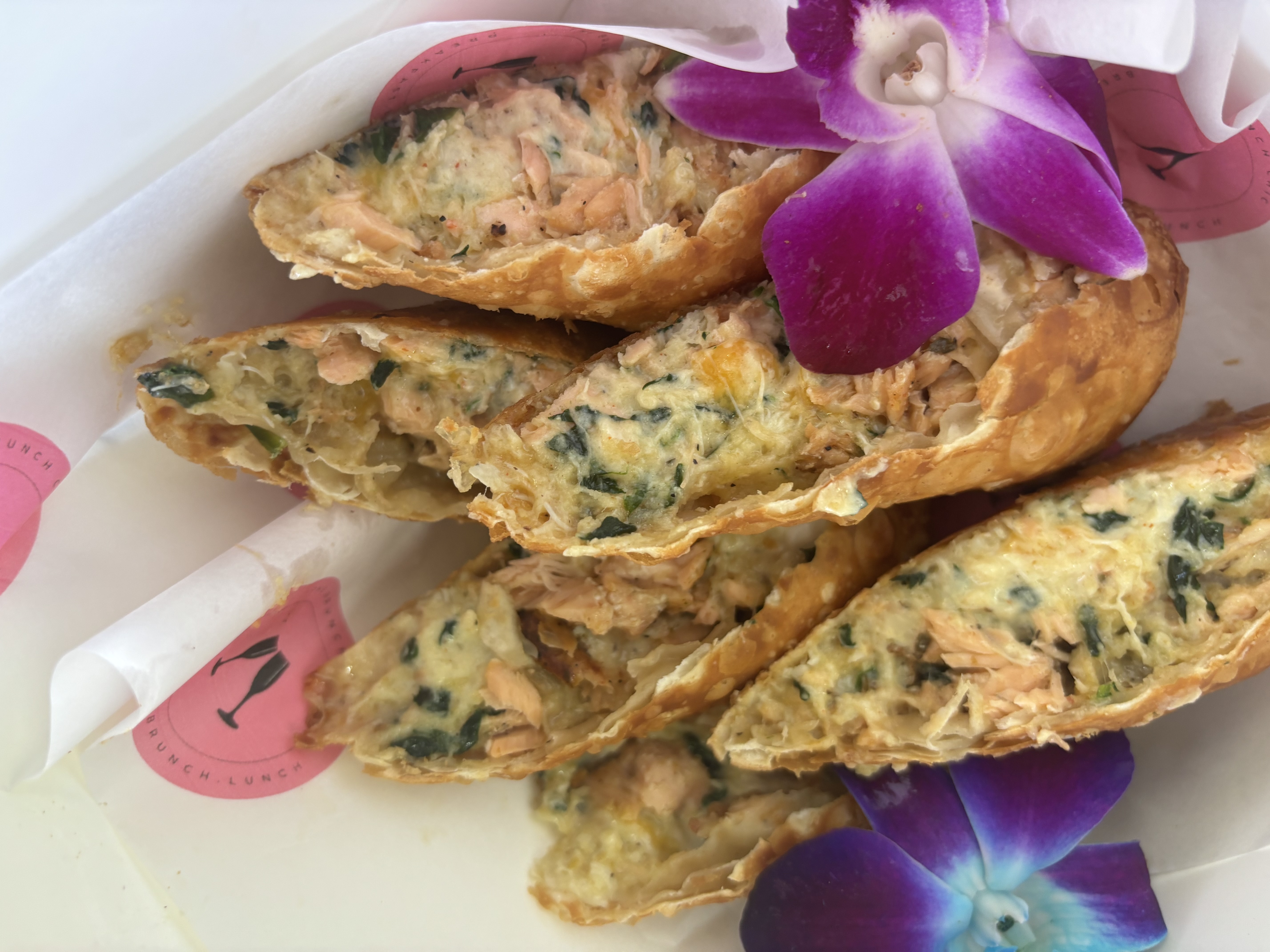 Crispy egg rolls generously stuffed with a flavorful mix of lump crab, tender salmon, and succulent shrimp, perfect for seafood lovers.