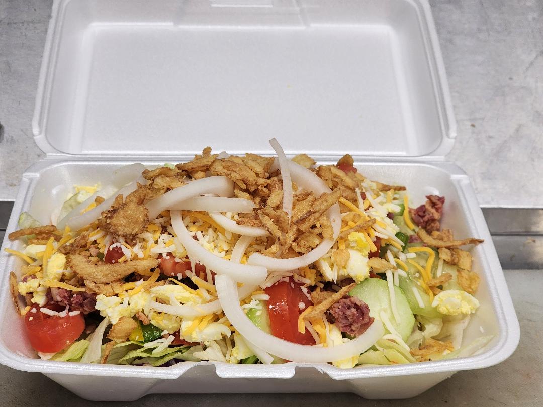 Mixed Greens, with tomatoe, cucumber, bell pepper ( red, green, orange, and yellow), onion, bacon, egg, french onion, with your choice of Home made Ranch, French or Italian Dressing.
