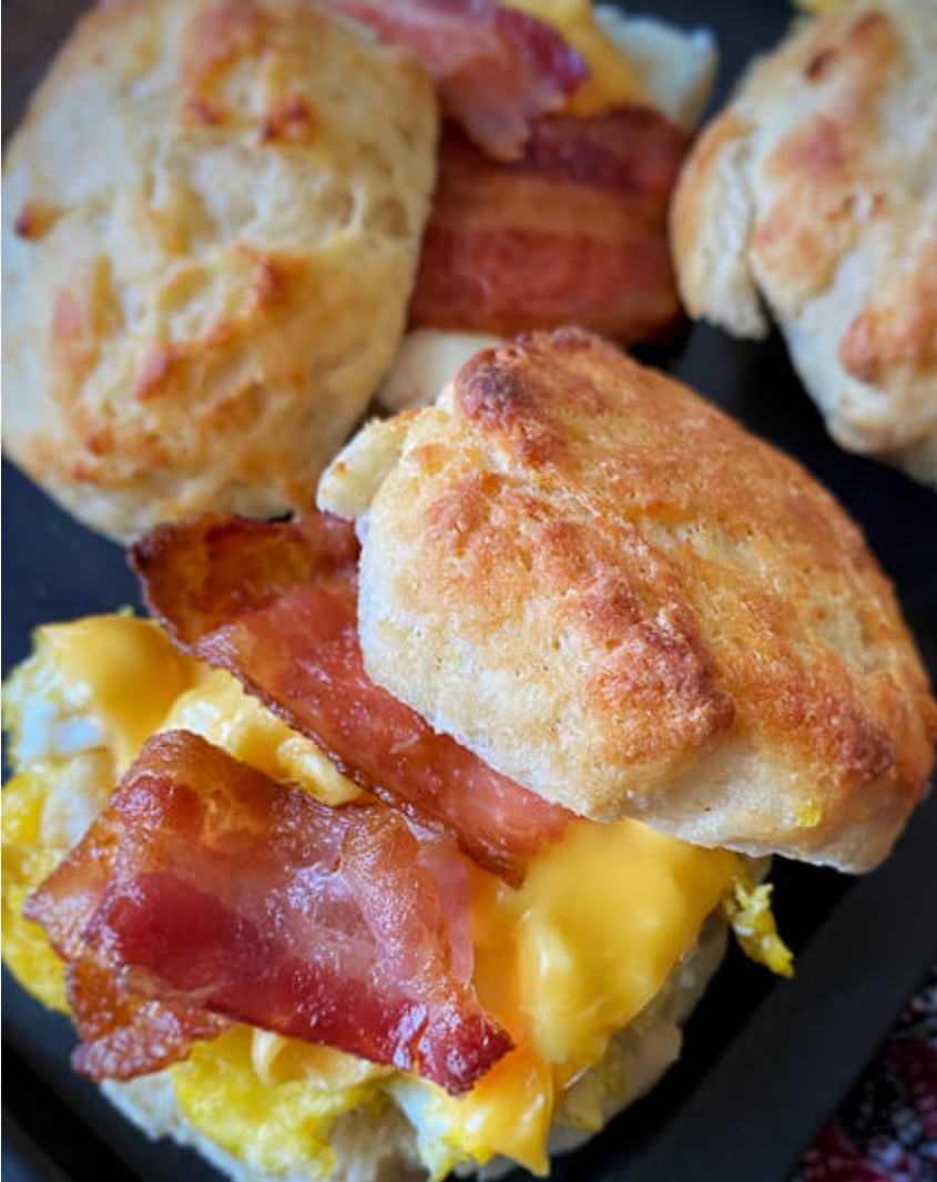 2 biscuit, 2 egg, 2 bacon, 2 sausage with gravy and cheese