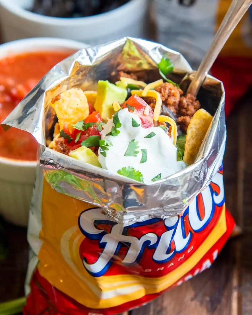 Walking Taco in a bag of Fritos with seasoned beef, lettuce, tomato, cheese, and sour cream with jalapeƱos.