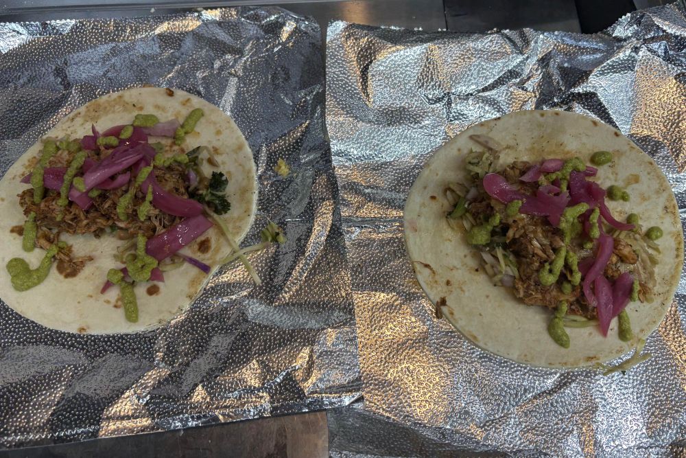 Two warmed soft tortillas topped with our broccoli slaw, smoked grilled chicken tossed in a raspberry chipotle barbecue sauce, pickled red onions, and drizzled with a roasted poblano cream sauce.