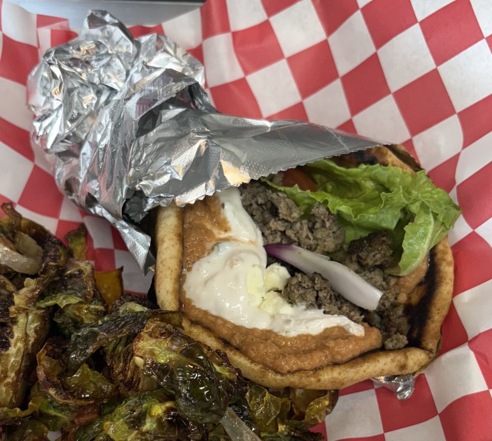 In Germany we called them Doner Kabobs, but it’s the same thing. We make everything homemade: warmed pita bread, tzatziki, hummus, gyro meat made with 50/50 lamb and beef, with lettuce, tomato, onion, and feta.