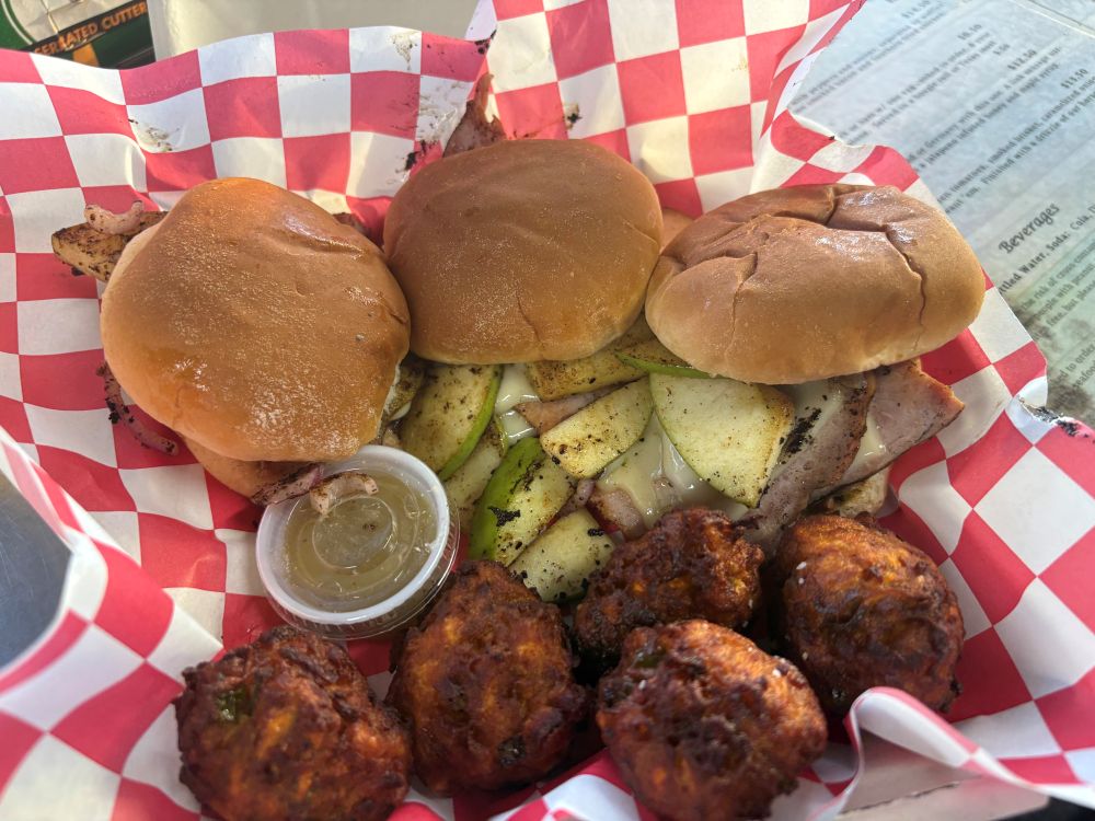 Three sliders with our collard greens pesto, Black Forest Ham, Swiss cheese, caramelized onions & savory apples.