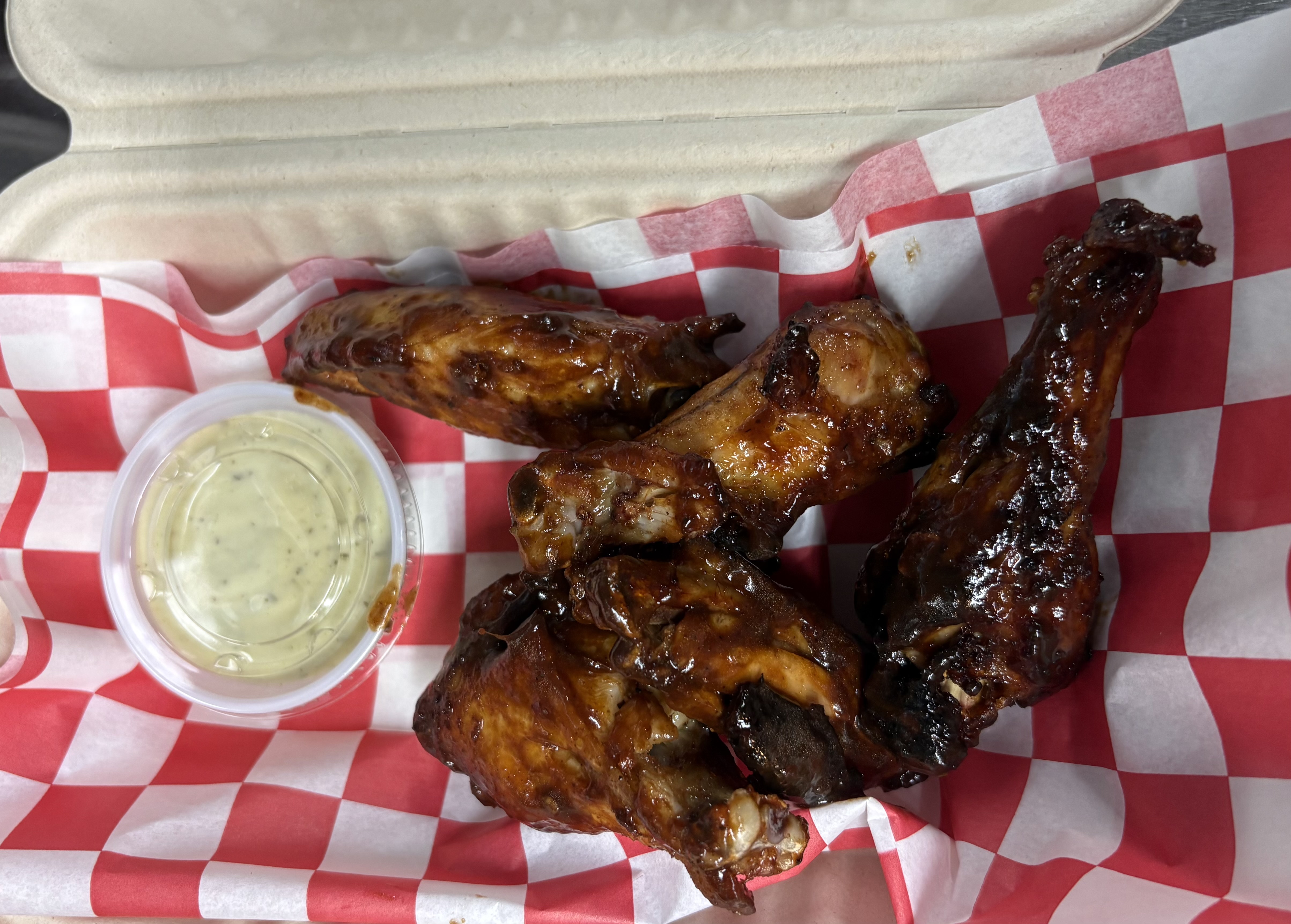 Drums and flats apple smoked and finished with raspberry chipotle BBQ sauce. Served with your choice of lime cilantro ranch or blue cheese.