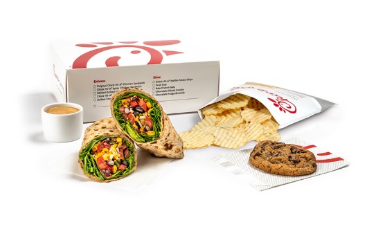 Chicken Cool Wrap with a Fruit Cup and a Chocolate Chunk Cookie. Drink NOT included.