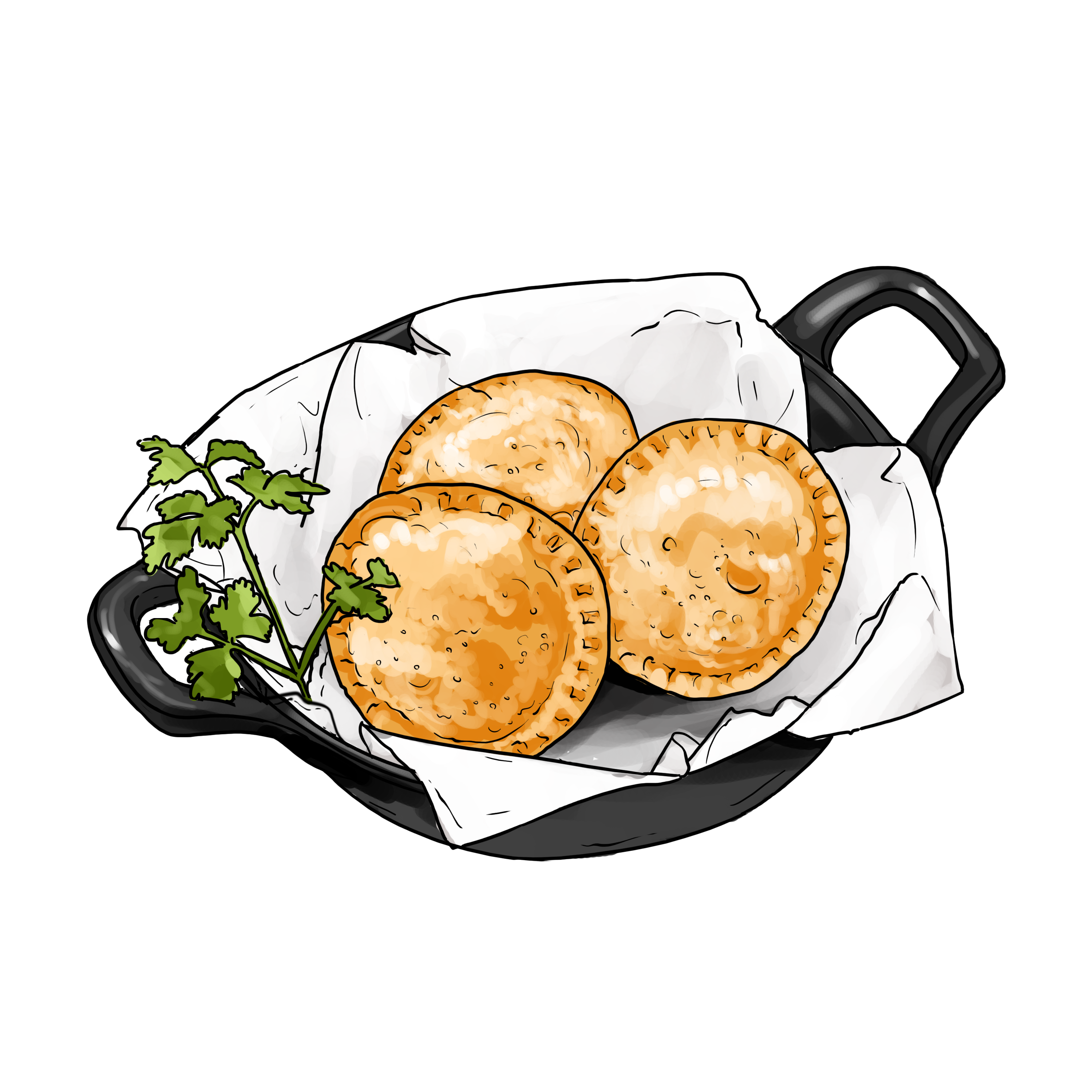 3 Deep-fried hand pies filled with your choice of beef, chicken, cheese blend, ham & cheese, pizza, and cuban.