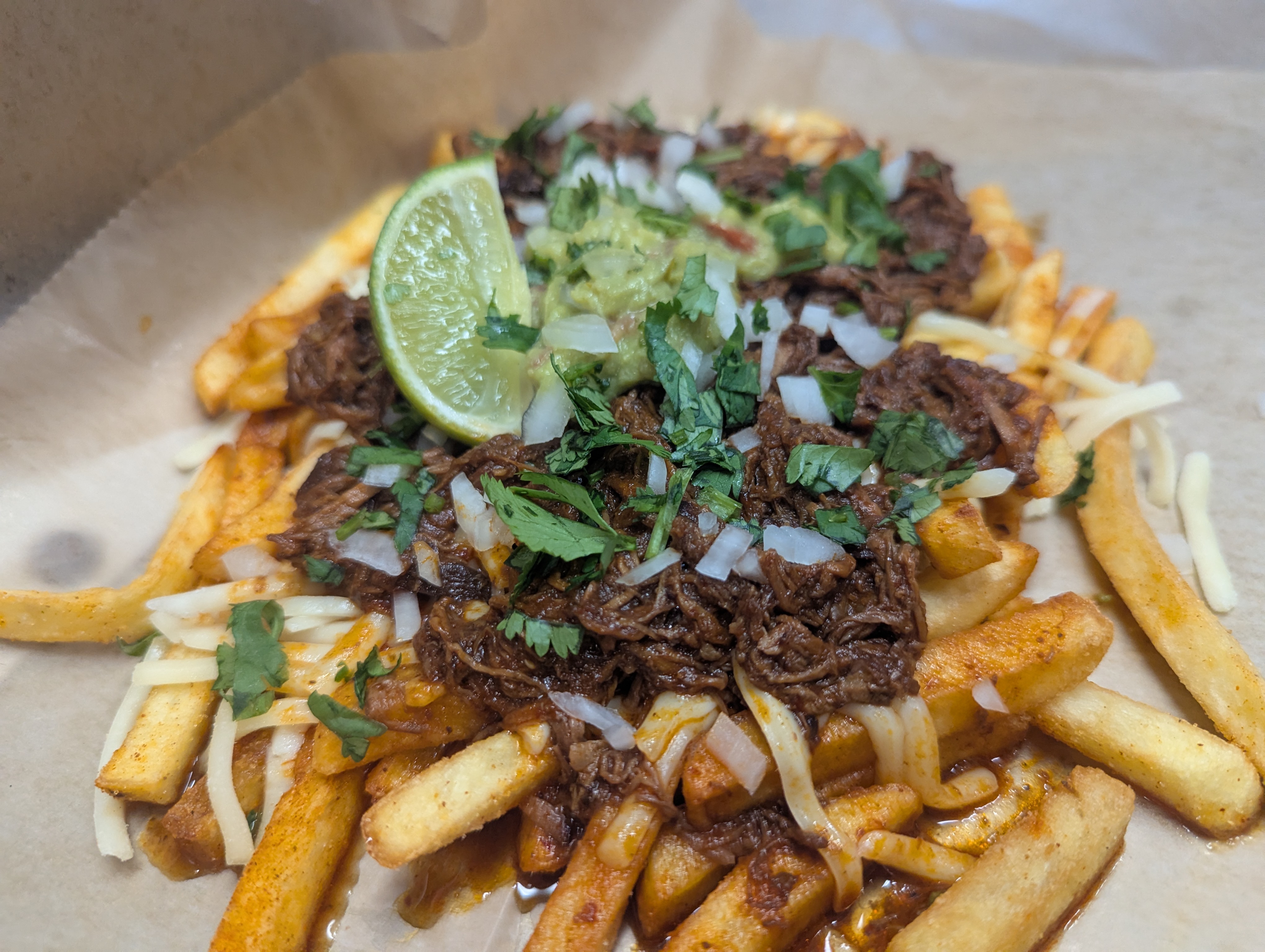 Fresh fries loaded with jack cheese, slow braised Mexican spiced Birria, onion, and fresh limes