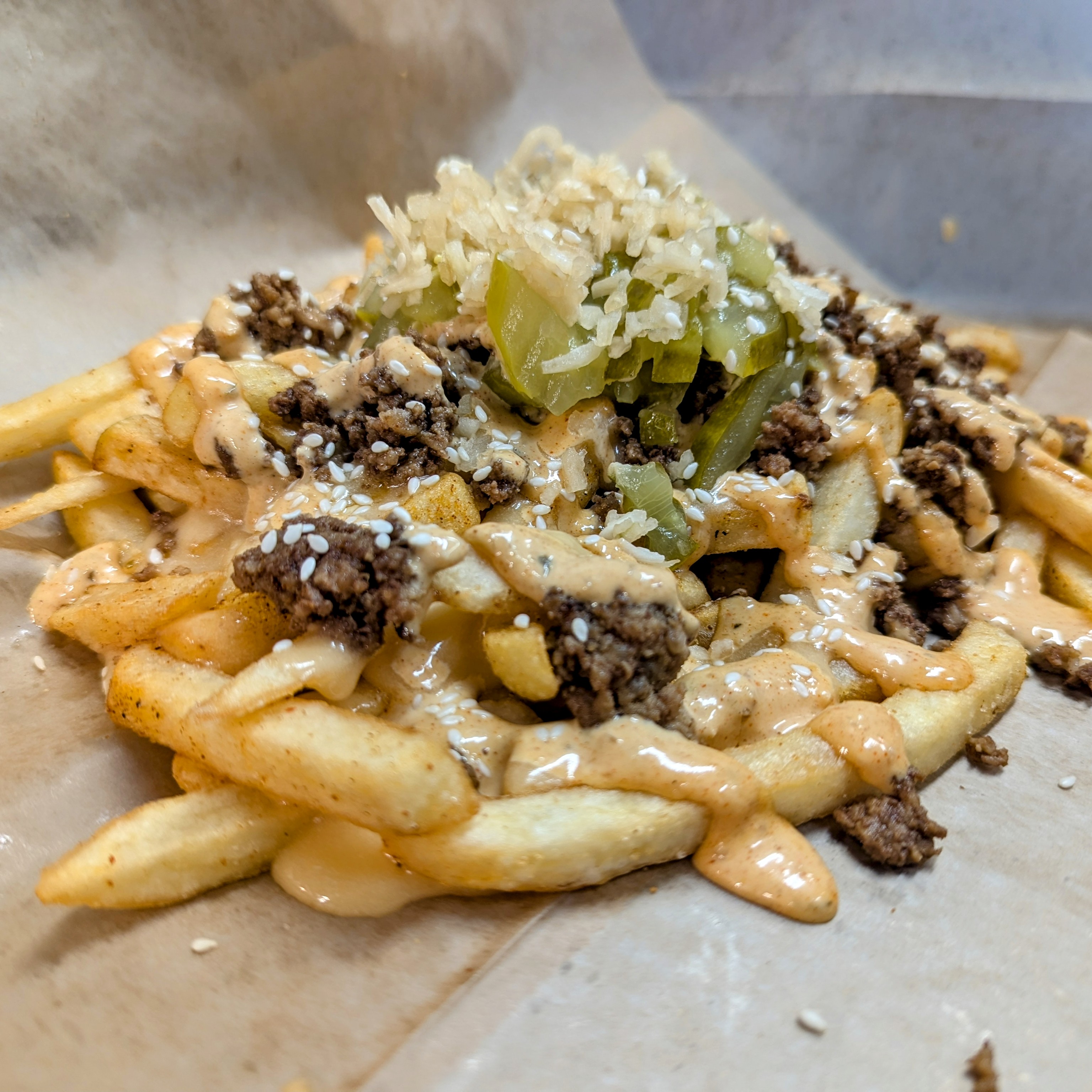 French fries covered with seasoned burger, cheddar sauce, chopped pickles, onions, sesame seeds, and burger sauce.