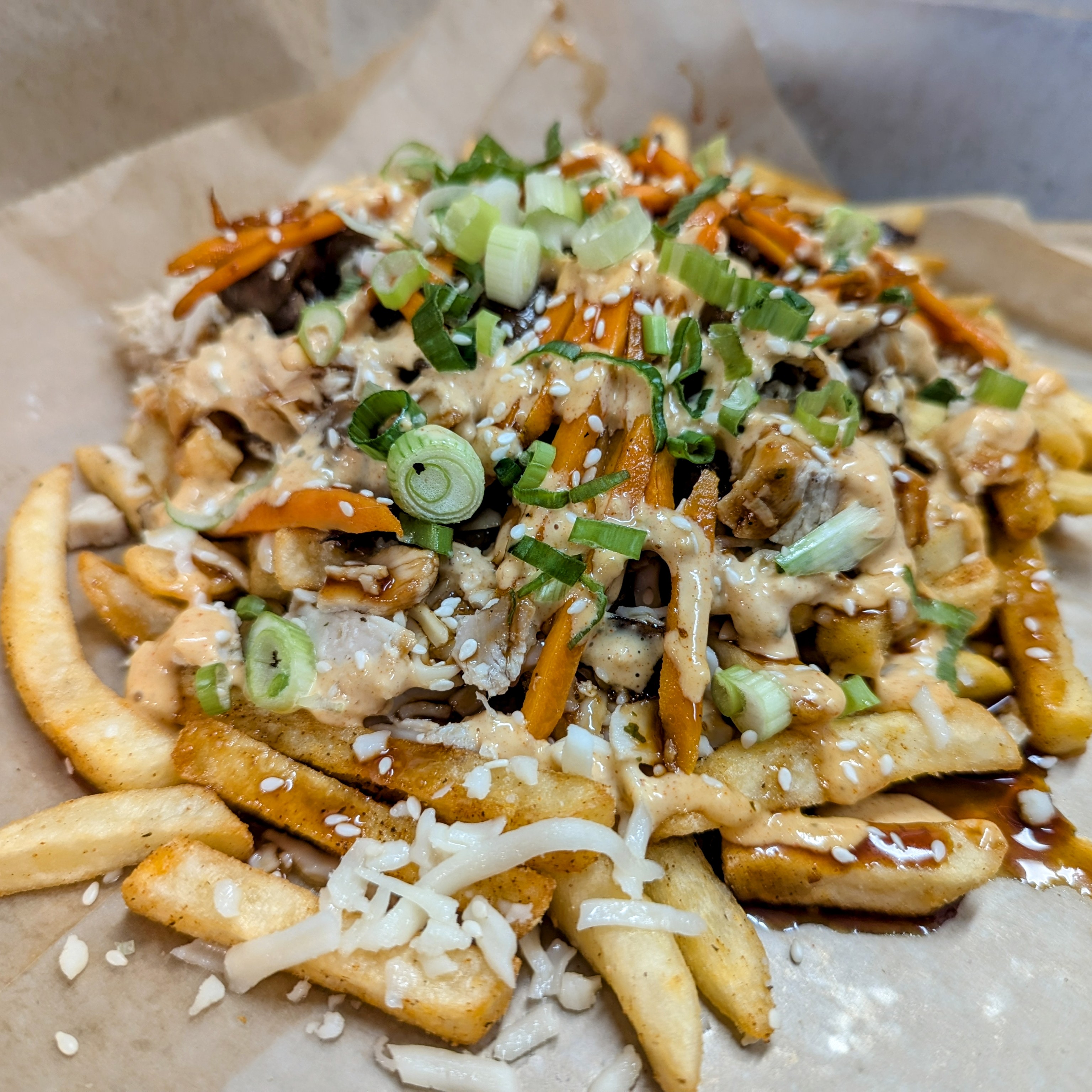 Fries covered with mozzarella, teriyaki glazed chicken, green onion, yum yum sauce, stir fried mushroom, carrot, & green onion.