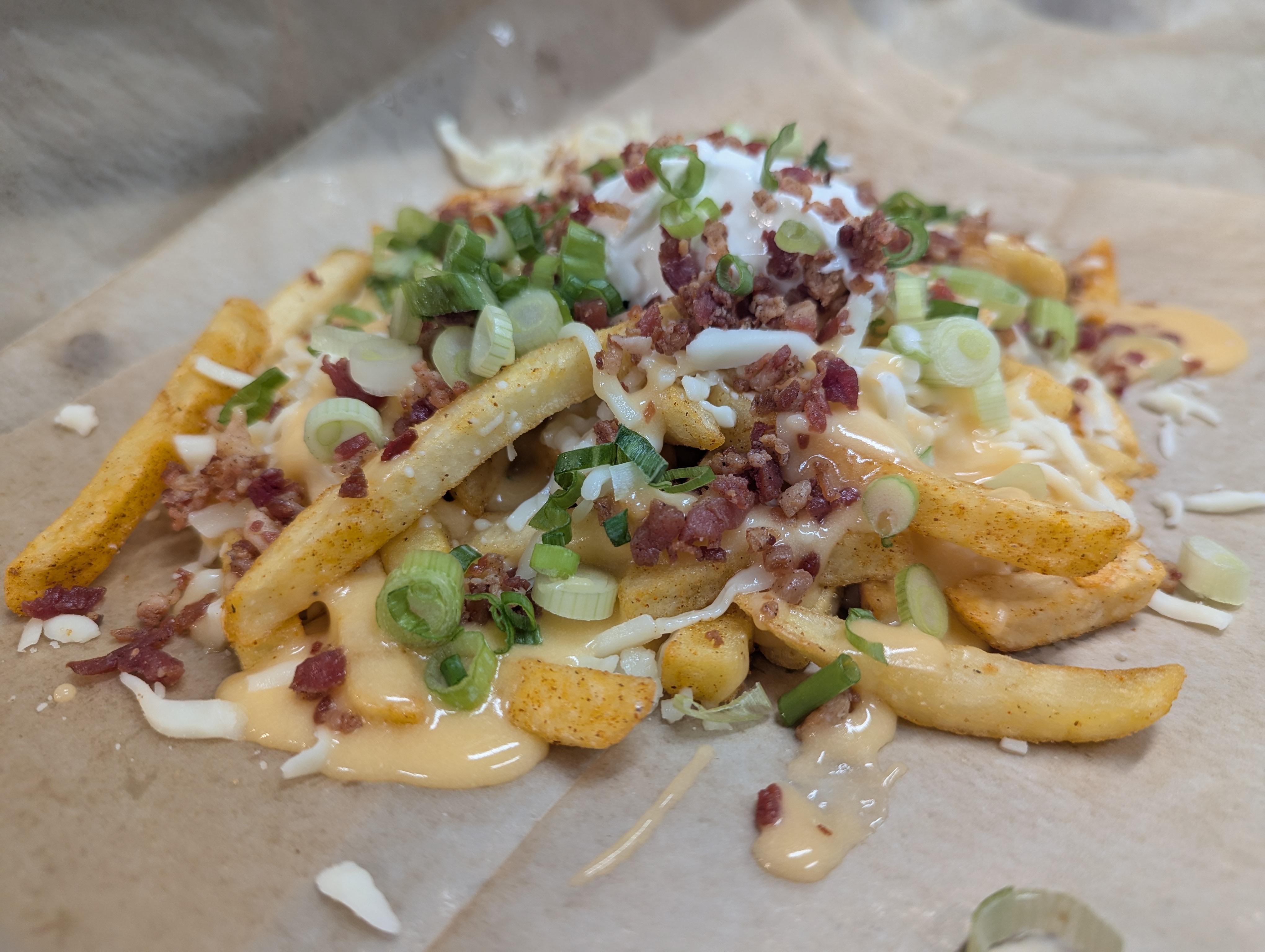 French fries topped with extra bacon, cheddar sauce, green onion, and sour cream.