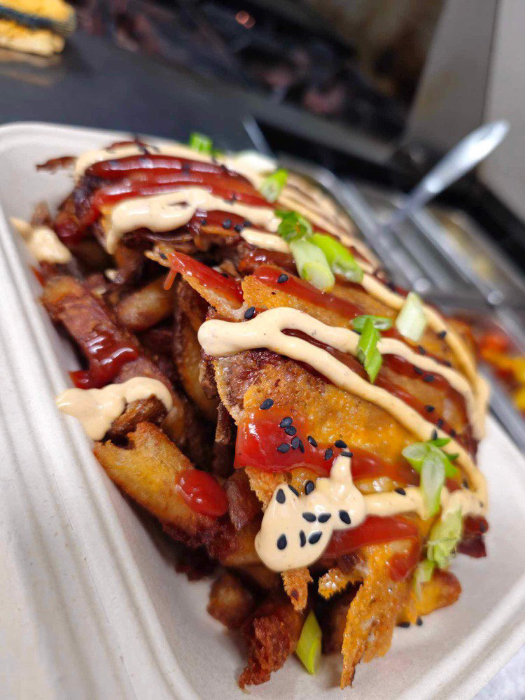 mozarella cheese,ketchup, chipotle aioli, teriyaki sauce, green onions, sesame seeds, choice of meat