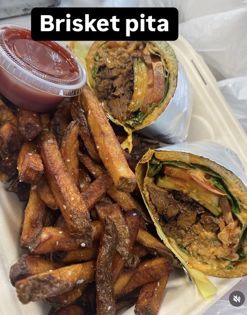 pita bread, spinach, tomato, cucumber, onion, side of fries