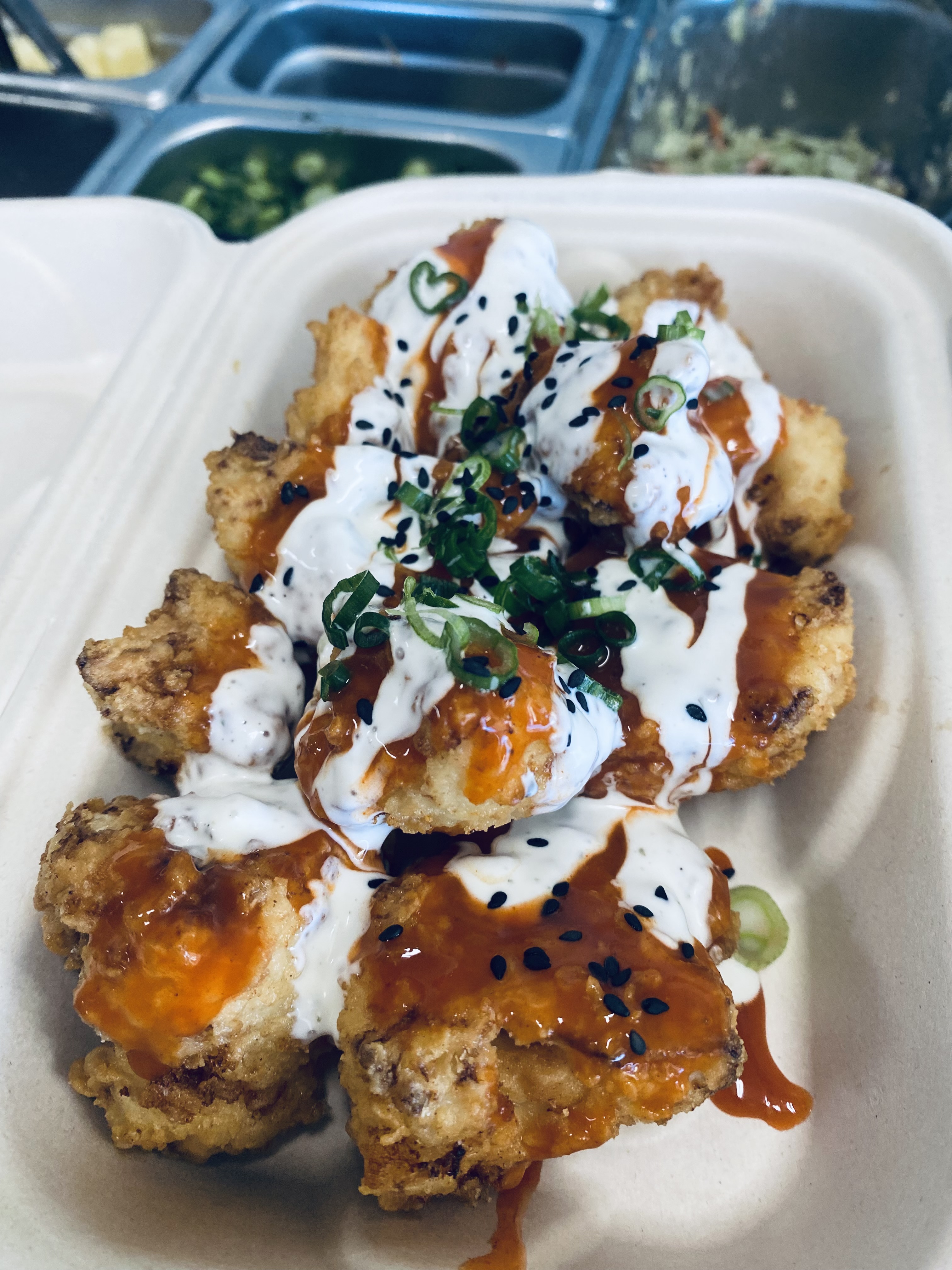 fresh cauliflower breaded and fried to perfection topped with buffalo sauce and ranch, green onions and sesame seeds