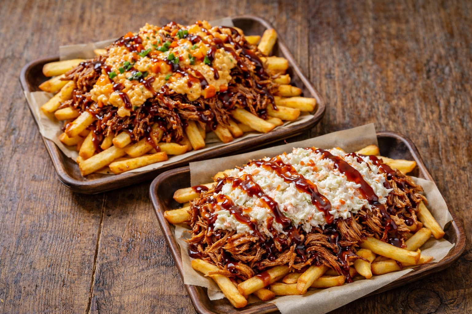 French Fries topped with BBQ Pulled Pork and Pimento Cheese OR Slaw. A meal in itself!