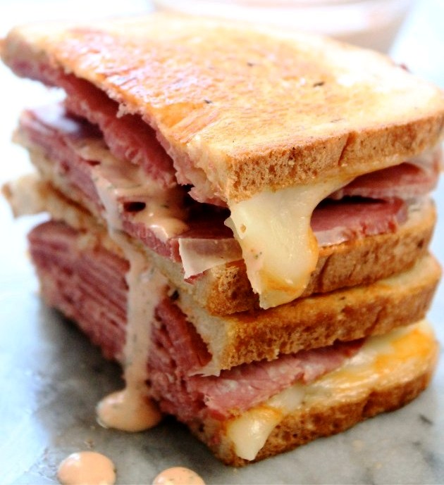 slow roasted corned beef with muenster cheese on toasted rye with our chili dill aioli.