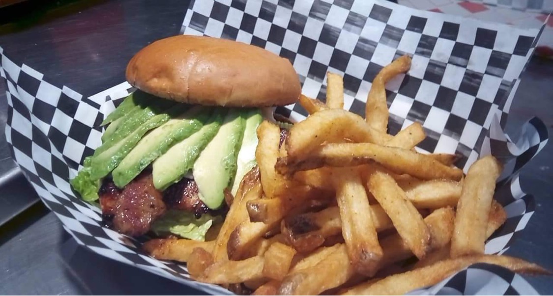 Signature MOB Burger topped with Bacon, Avocado, Provolone Cheese & MOB’s Marinated Grilled Onions on top of a La Baguette Fresh Baked Bun & Hand Cut Fries