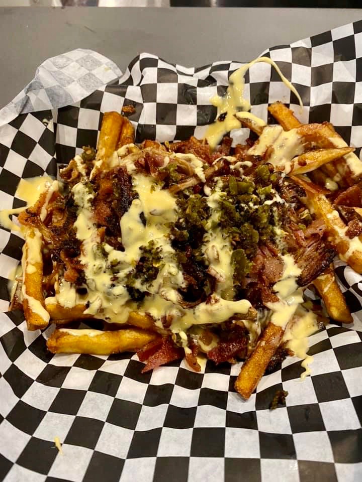 MOB’s Signature Cheese Sauce poured over our Hand Cut Fries, Bacon, Pulled Pork & Grilled Marinated Jalapeños