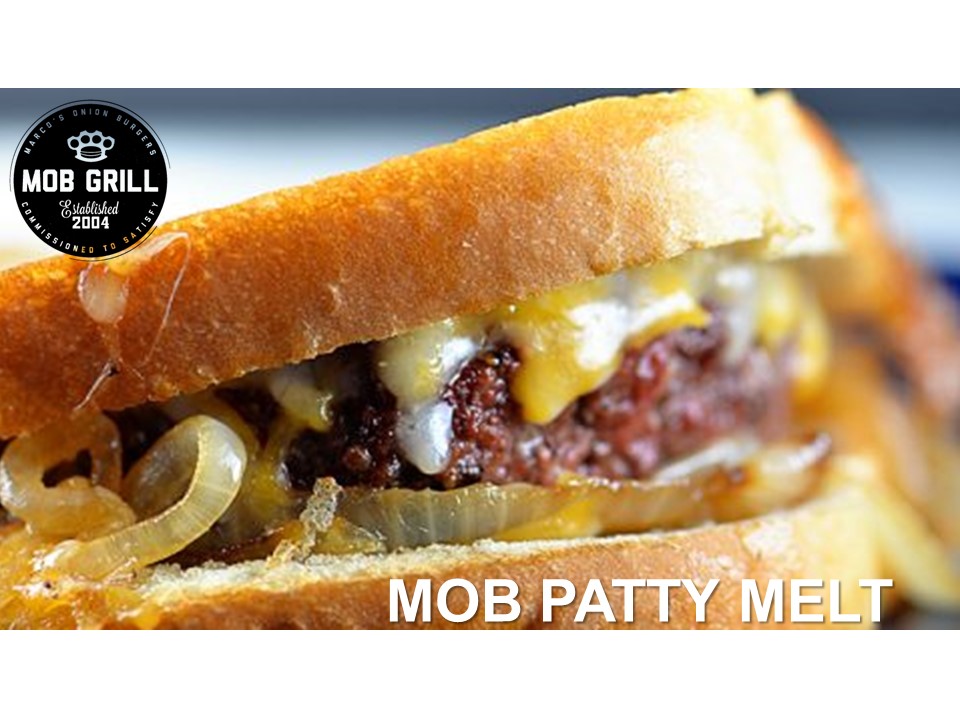 MOB’s Signature Burger: 1/3lb of Daily Fresh Ground Select Cuts of Black Angus Beef [Ribeye Steak-Shhhh], American Cheese & MOB’s Marinated Grilled Onions on a La Baguette Fresh Baked Bun served with Hand Cut Fries