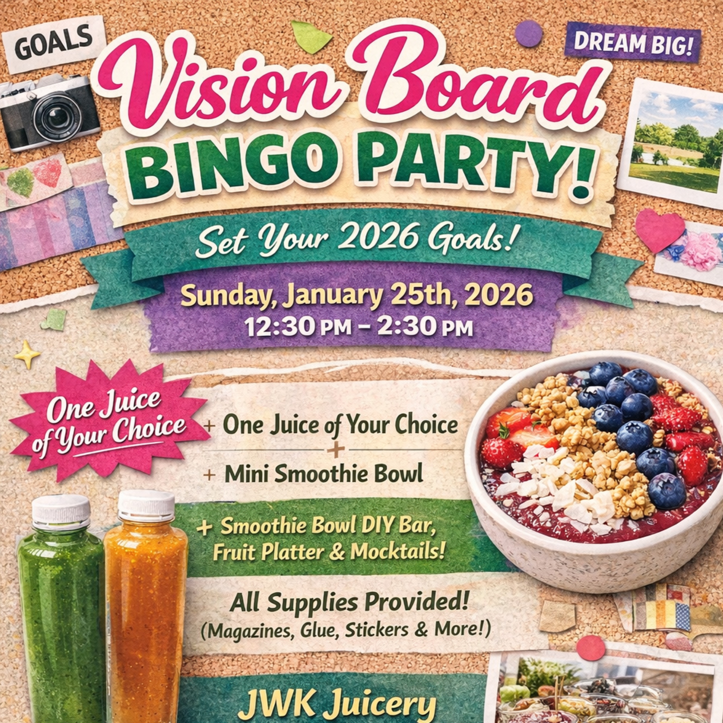 ? Vision Board Bingo Party ? Sunday 1/25/26 | 12:30 PM – 2:30 PM Join us for a fun, relaxed, and intentional afternoon designed to help you align, reflect, and set powerful goals for 2026. This is a free-flowing event, so you’re welcome to arrive anytime during the window and stay as long as you’d like — no pressure to stay the entire time. Your ticket includes everything you need — just bring yourself ?? ?? What’s Included: All vision board supplies (markers, glue, boards, magazines, and more — no need to bring anything) ?? One juice of your choice ?? Build-Your-Own Smoothie Bowl Bar ?? Fresh fruit platter ?? Fun, refreshing mocktails We’ll be creating vision boards, chatting, catching up, and intentionally setting goals together in a relaxed, supportive environment. Whether you stay the full time or pop in to create your board and mingle, you’ll leave feeling clear, aligned, and energized. ?? Location: JWK Juicery 1065 Reading Road, Suite 3 Mason, Ohio We’re located between Harbor Freight and H&R Block. ?? Look for the Juice Bar flag flying out front that says “We’re Open.”