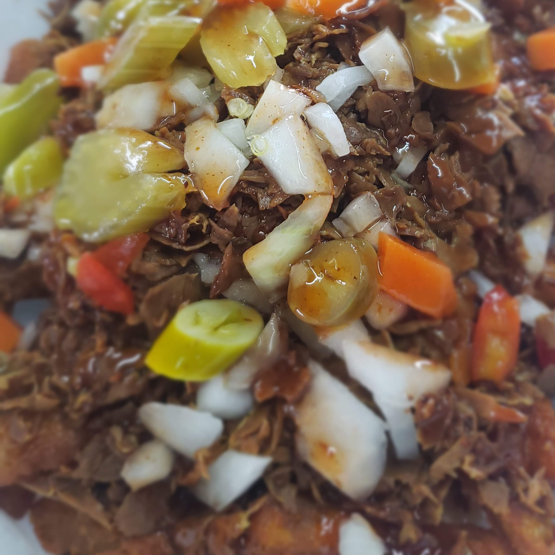 Seasoned fries | Italian beef | Chopped onions | Giardiniera hot peppers | Mild sauce