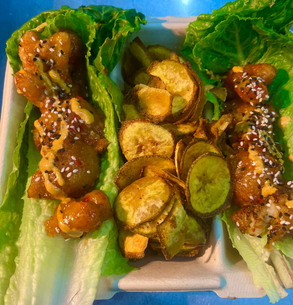 Classic bang-bang crispy cauliflower tossed in sweet chili sauce. Includes crispy plantain chips and rice and beans