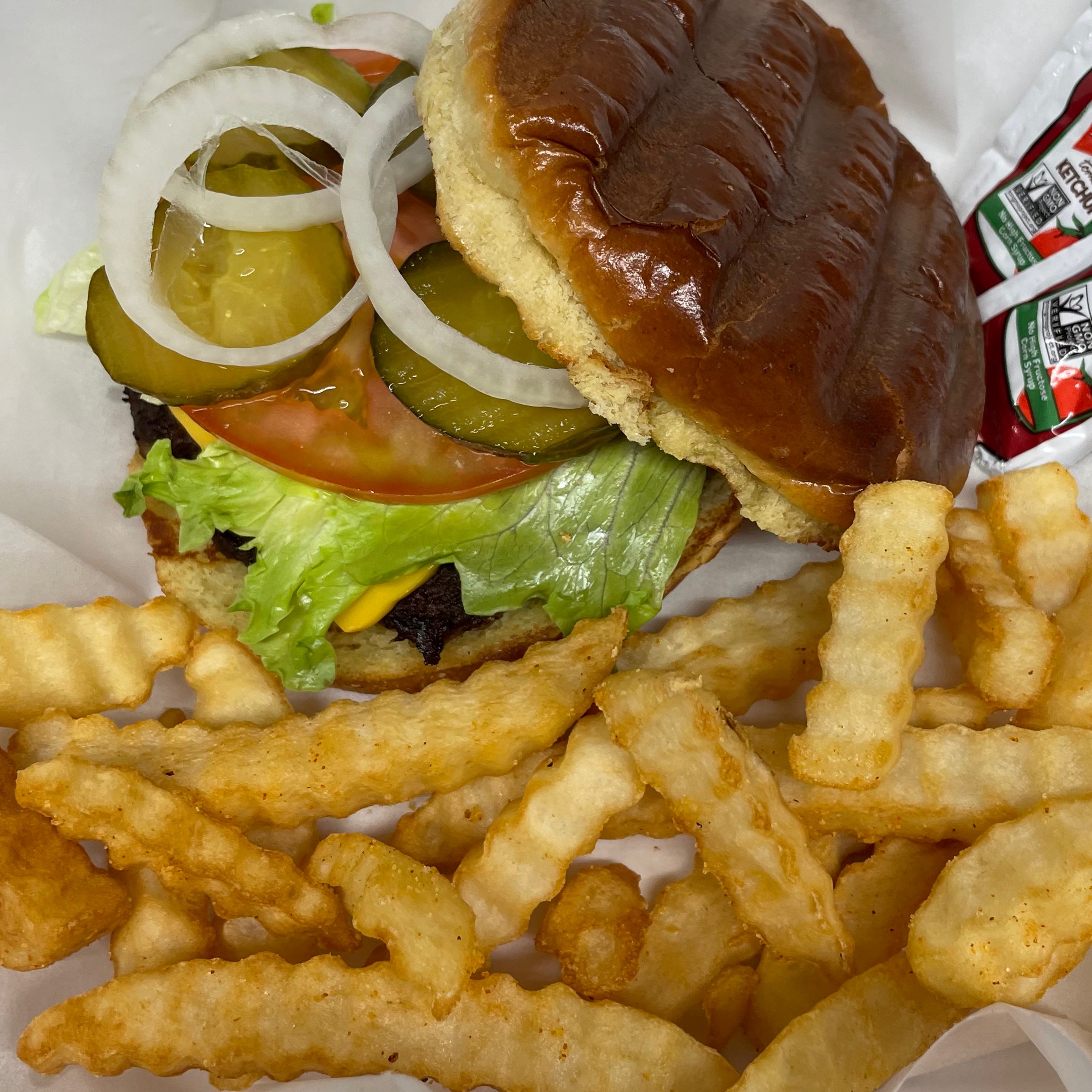 1/4 pound seasoned patty with American cheese and toppings of choice on a brioche bun served with FF or TT and a drink