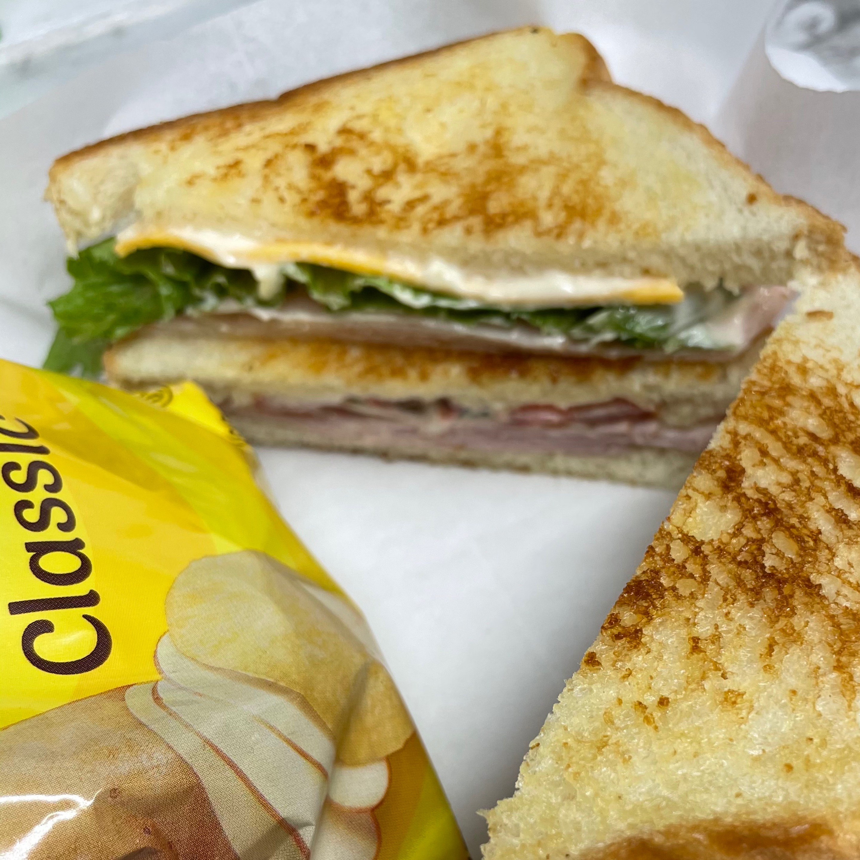 Sliced ham, Swiss cheese, and toppings of choice on Texas toast served with chips and a drink