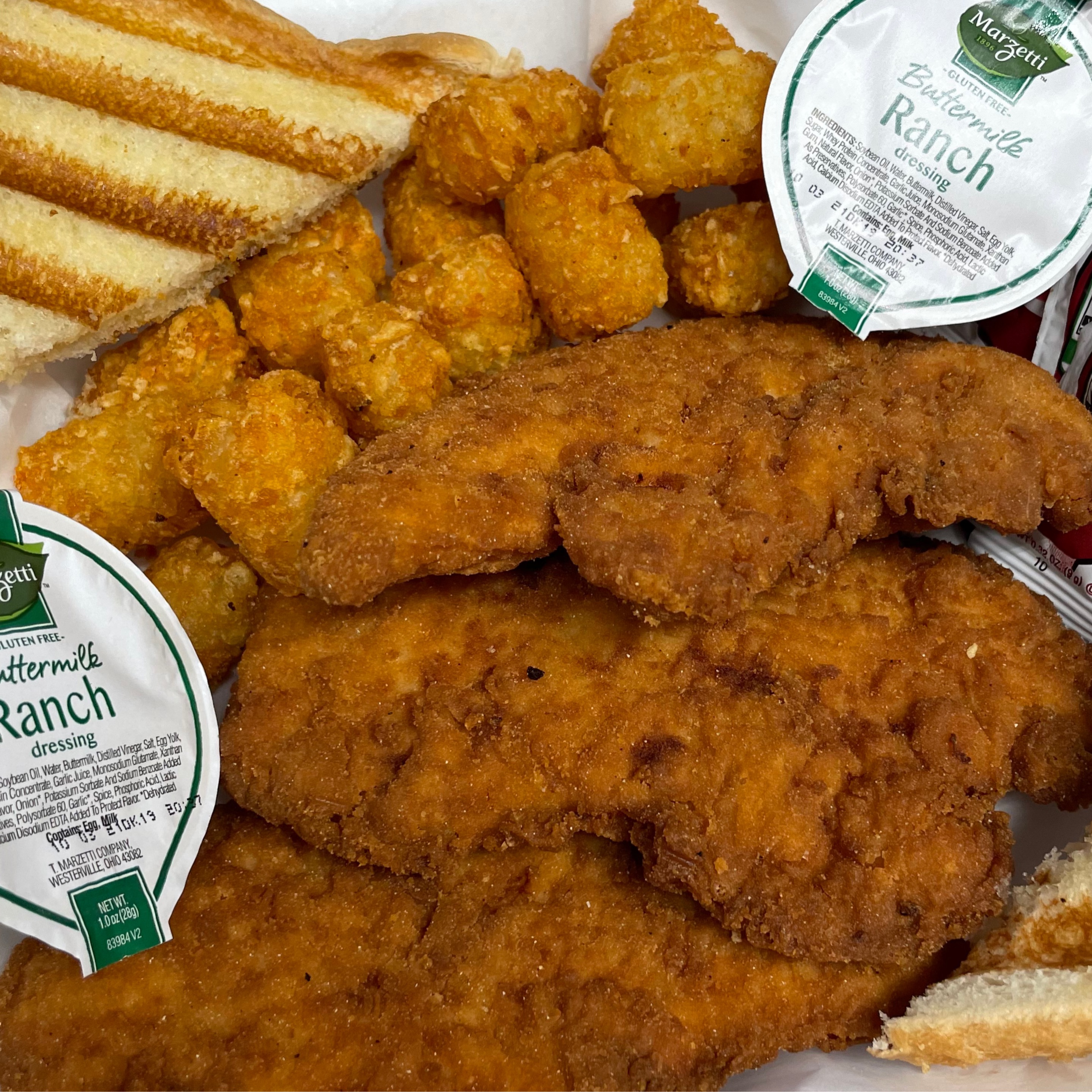 Three lightly breaded chicken strips served with two ranch dressing dipping sauces, FF or TT, Texas Toast, and a drink