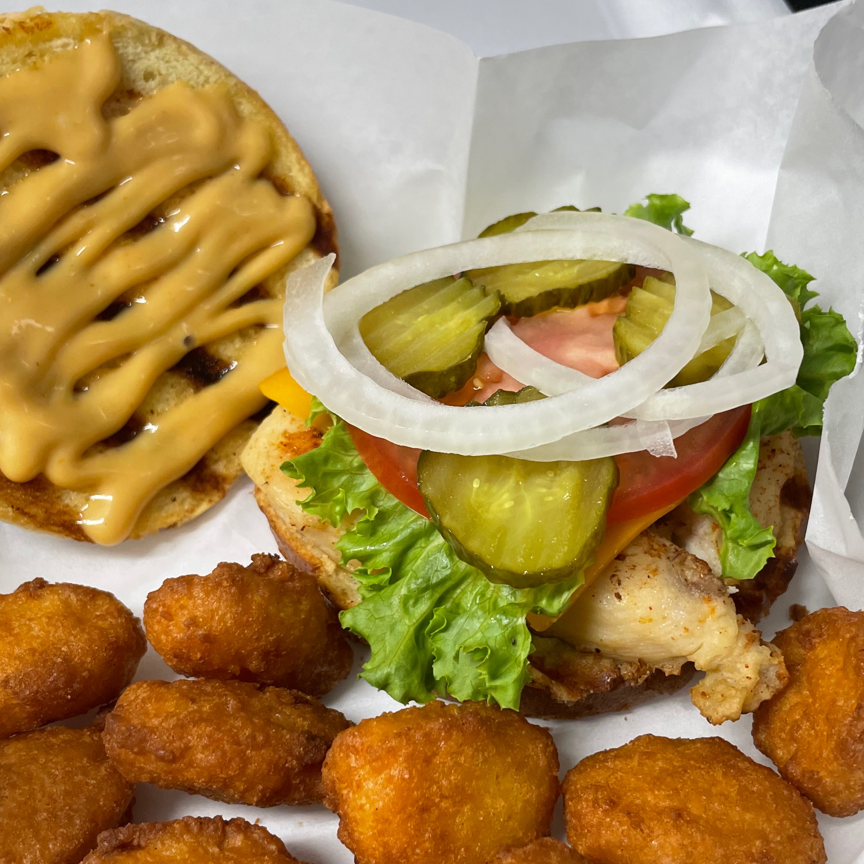 4 oz seasoned grilled chicken breast with cheddar cheese, lettuce, tomato, onion, pickle, and special chicken sauce on a brioche bun served with TT or FF and a drink