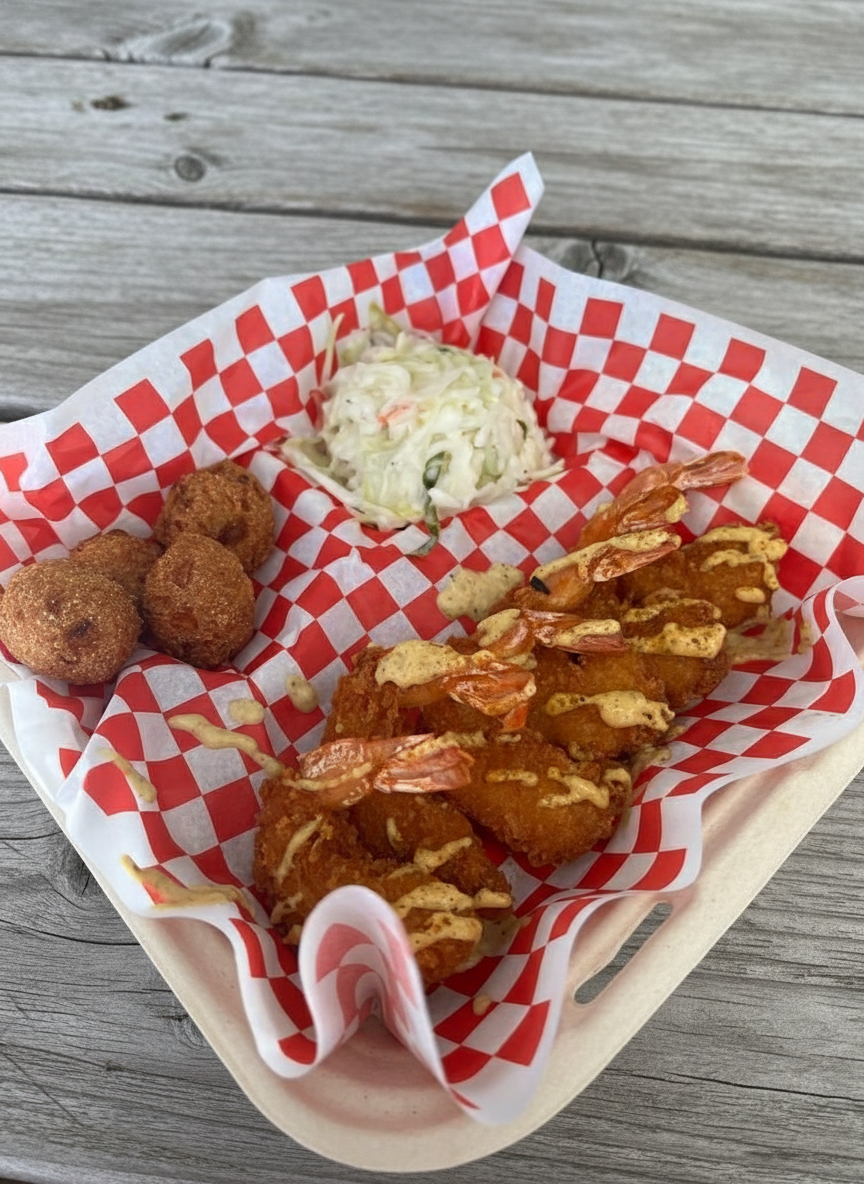 Extra Jumbo Breaded Fried Shrimp drizzled in our homemade Cajun Sauce and served with Hush Puppies and Coleslaw