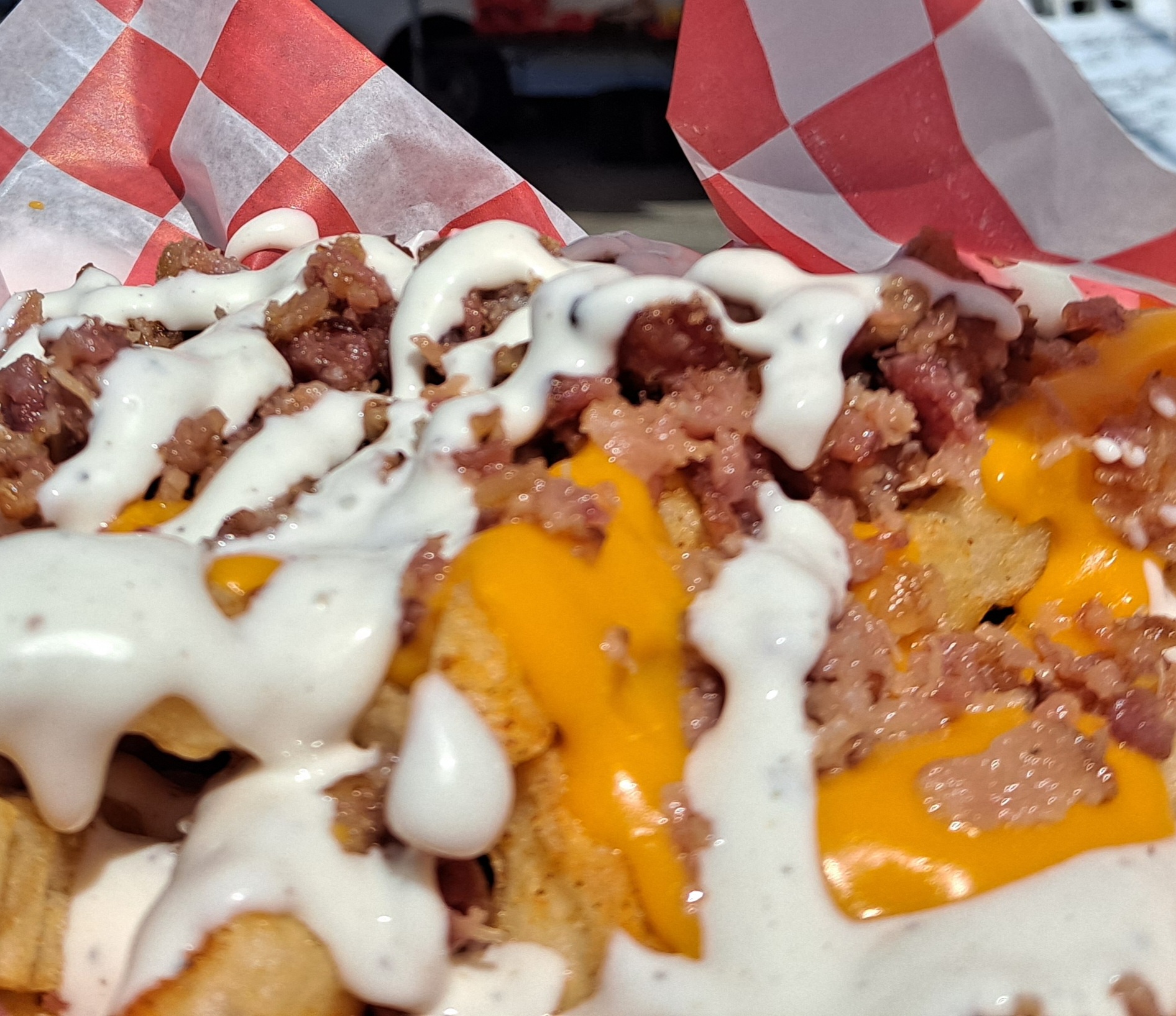 A huge portion of crinkle cut fries cooked to perfection then covered in cheese and buttermilk ranch dressing. Finally it is topped with a generous portion of real bacon bits.
