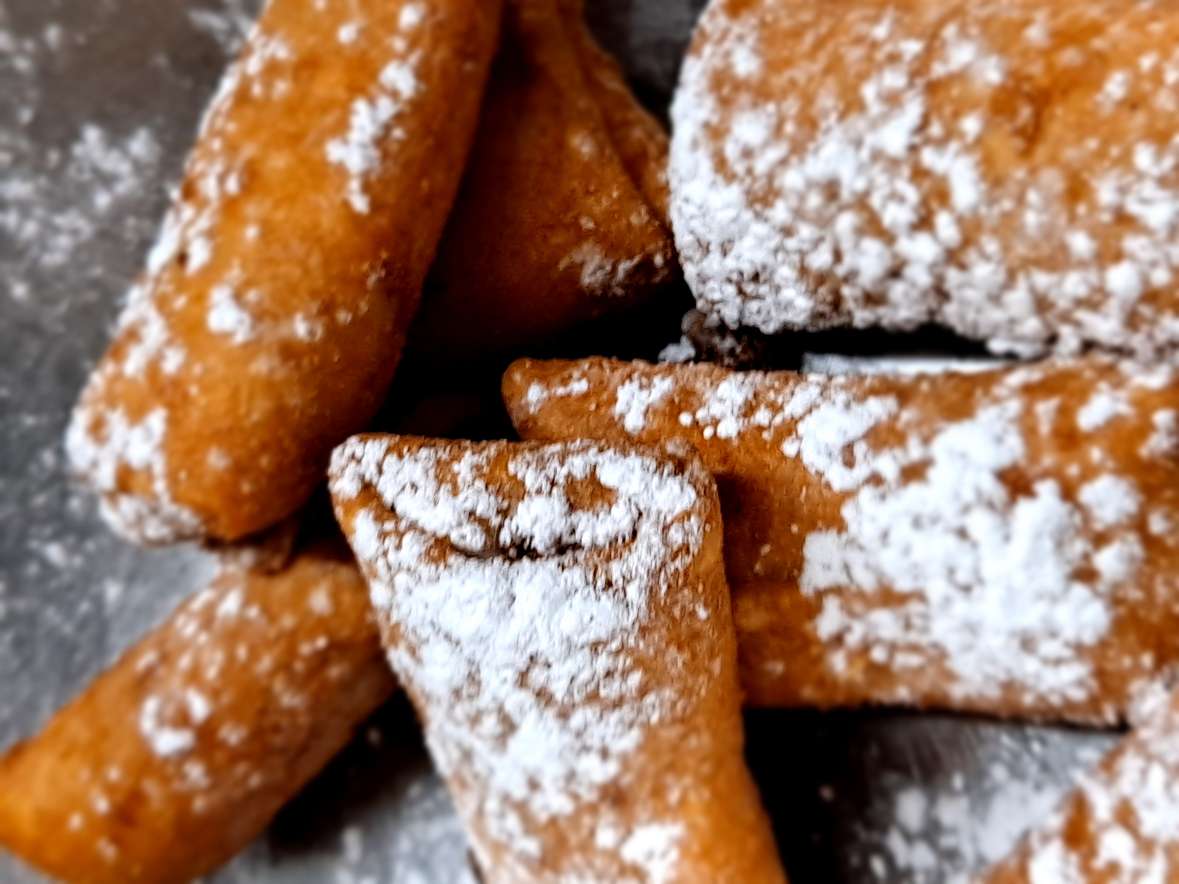 Delicious deep fried apple strudel topped with powdered sugar.